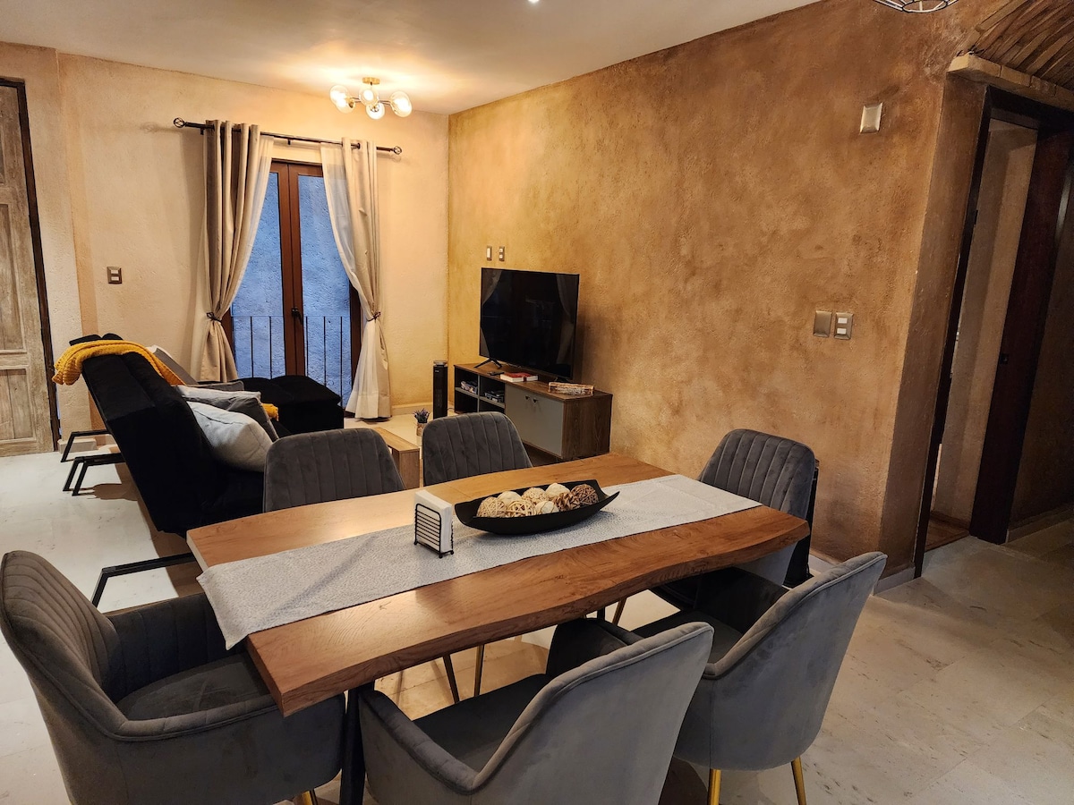 Descubre un loft acogedor y moderno, ideal para parejas, amigos o viajeros. A minutos del centro, combina estilo industrial y calidez con techos y muebles de madera, iluminación suave y plantas naturales. Sala con sofá de piel y mesa de madera para charlas o cenas. Cocina equipada con cafetera, freidora, parrilla y frigobar. Dormitorio con cama flotante y Smart TV. Cuenta con regadera eléctrica. Jardín compartido ideal para disfrutar al aire libre. Permite música moderada hasta las 2 am.