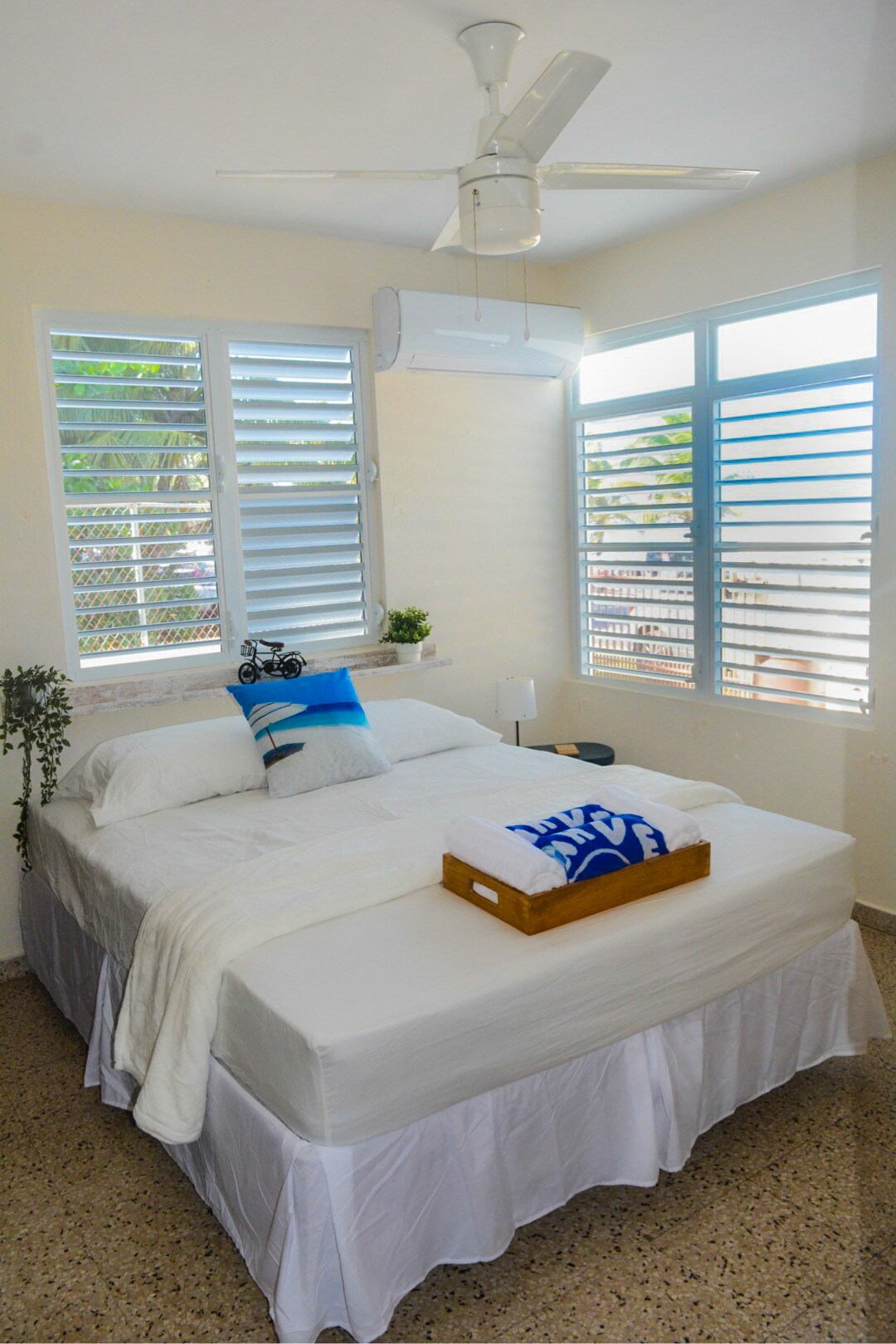 The property is now equipped with solar panels! No more power problems! Two-bedroom, one bathroom, second floor apartment with private entrance and private parking. Beautiful kitchen, very big balcony and comfortable living room. High Speed Internet. Three (3) minutes walk to the beautiful Mar Bella (Puerto Nuevo) a Blue Flag Award Certification Beach. There are several restaurants, bars/pubs, food trucks, grocery stores, bakery, pharmacy and gas stations nearby (1-6 minutes away) .