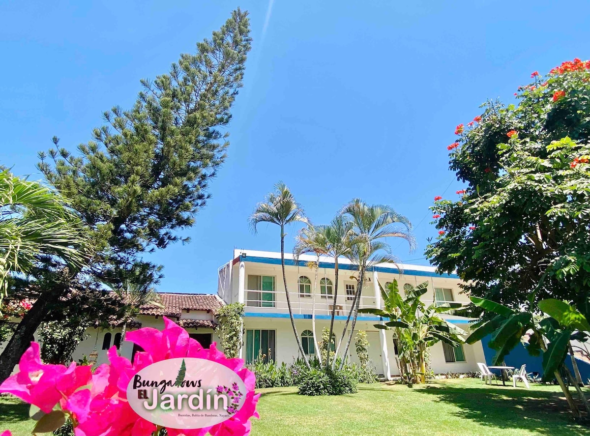 Es un lugar tranquilo y muy agradable con un jardin grande y verde. Con una ubicacion excelente en el centro de la zona dorada sobre la avenida del turista, rodeado de los mejores restaurantes y comercios a tan solo 1 cuadra de la playa y cercas del centro de Bucerias. .