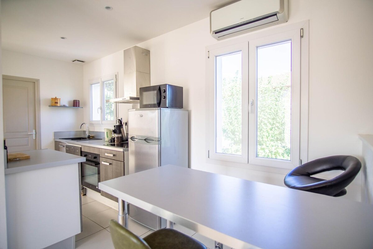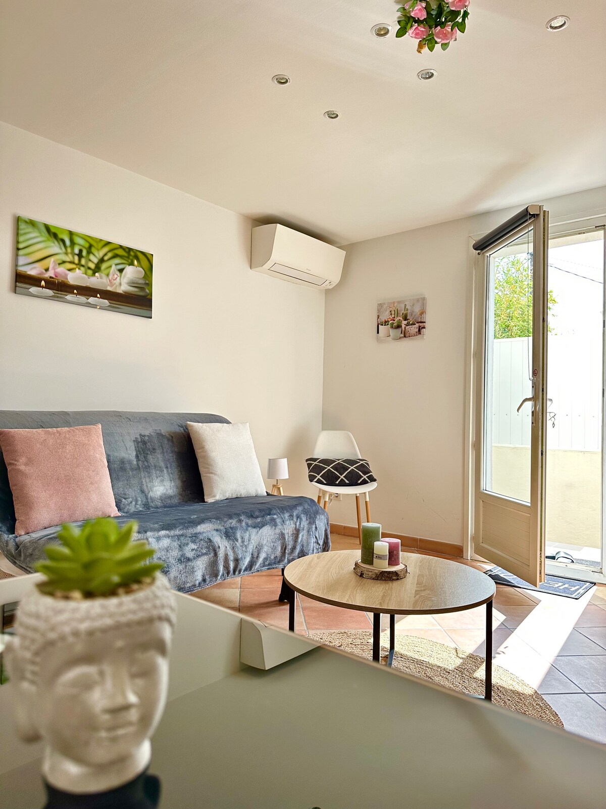 Relájese en este alojamiento tranquilo y elegante. Completamente renovado que incluye una cama King size y un sofá cama. Ducha italiana 120x120 con inodoro separado, así como una cocina equipada completa todo con aire acondicionado, con una pequeña terraza. aprox: 10 minutos de las playas y muy cerca del parque Luna, Aqualand, rally kart, pintball familly, base de ocio…. y muchas hermosas caminatas alrededor de la roca de Roquebrune y el Macizo del Esterel.
