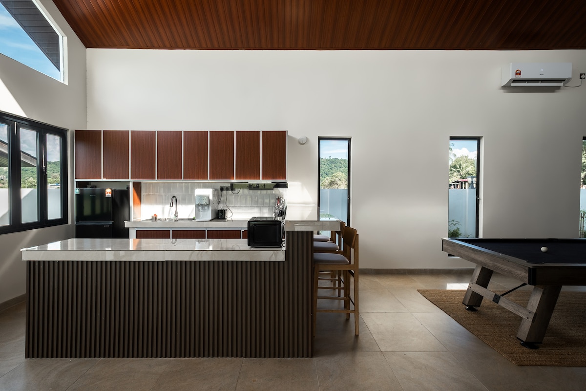Escápate a un paraíso en esta impresionante villa de estilo alpino en la isla de Langkawi. La experiencia del diseño tropical moderno se une a la naturaleza impresionante. Piscina infinita que se mezcla a la perfección con el horizonte, enmarcando la majestuosa montaña Gunung Raya en una vista perfecta para una postal. Sala de estar de planta abierta y cocina totalmente equipada. Dormitorio principal en la primera planta con cama tamaño king y balcón privado. A solo 5 minutos del aeropuerto y a 15 minutos de la vibrante playa de Cenang.