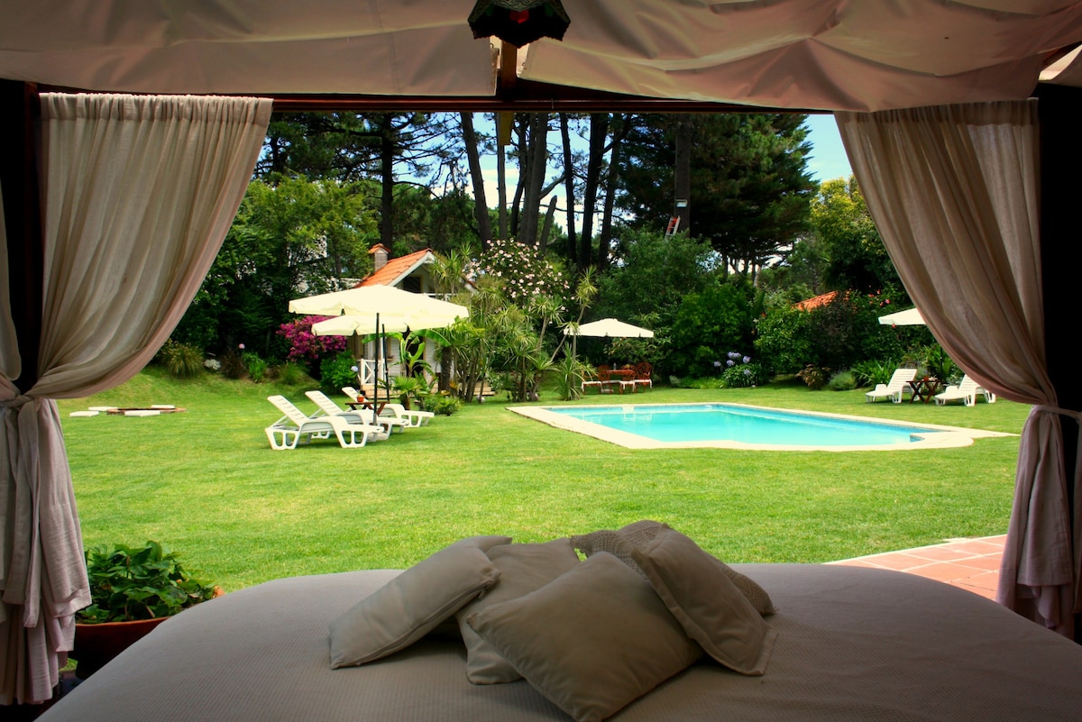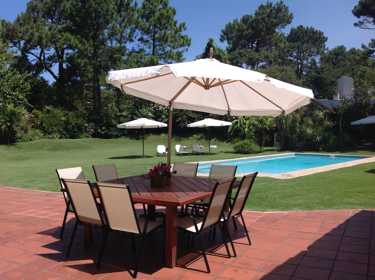 A 3 cuadras de la playa , zona cerca .de todo La casa es amplia , practica y tiene todo para unas increíbles vacaciones . Completa para 8 personas , gran parque , piscina climatizada- 2 suites más 2 dormitorios con camas individuales . Baños Impecable todo ropa de cama , toallas , reposeras. Espacios amplios disfrutando de estares y Terrazas al jardín con sillones , hamacas , todo acompañado de un encantador y cuidado entorno verde y con una hermosa piscina climatizada y reposeras. Confort