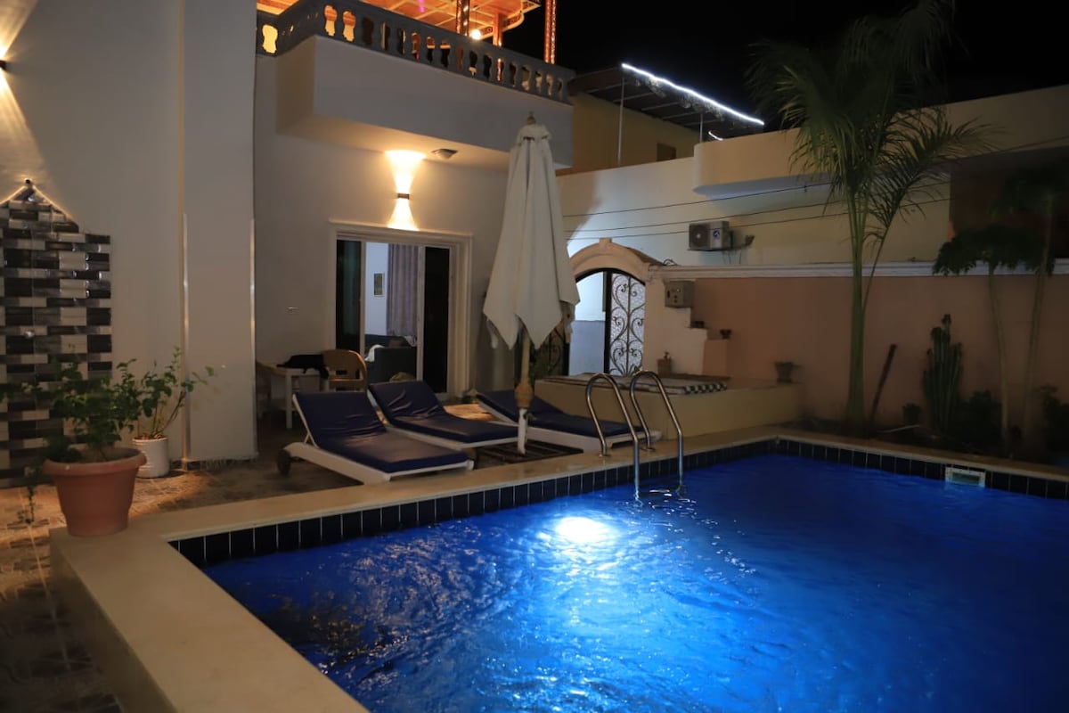 Disfruta de una casa de huéspedes privada y totalmente climatizada en la orilla oeste de Luxor, con una acogedora sala de estar, un dormitorio, un baño privado y una cocina totalmente equipada. Relájate en tu balcón privado o en la terraza de la azotea y date un chapuzón en la piscina compartida. A pocos minutos de lugares antiguos como el Valle de los Reyes y el Templo de Hatshepsut. Elegante, tranquilo y perfecto para una estancia cómoda cerca de la historia.