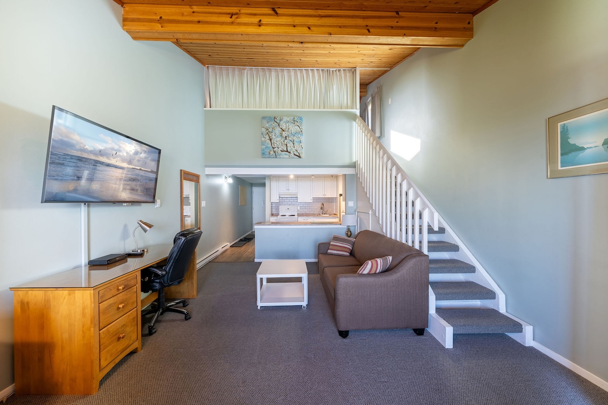 La única cama KING en el Shorewater. La mejor escapada frente a la playa. Suite estudio. 1 cama tamaño king, suite frente al mar, patio privado y un cómodo sofá cama tamaño queen. Ideal para parejas o familias pequeñas. Disfruta de la belleza de Qualicum Beach, con la playa de arena privada del centro vacacional y las hermosas vistas al mar de la costa oeste de Salish. Increíbles atardeceres, paseos, natación y avistamientos de vida silvestre desde tu patio privado. La espaciosa cocina es ideal para estancias largas. Aparcamiento incluido. Restaurantes, malecón y pueblo.