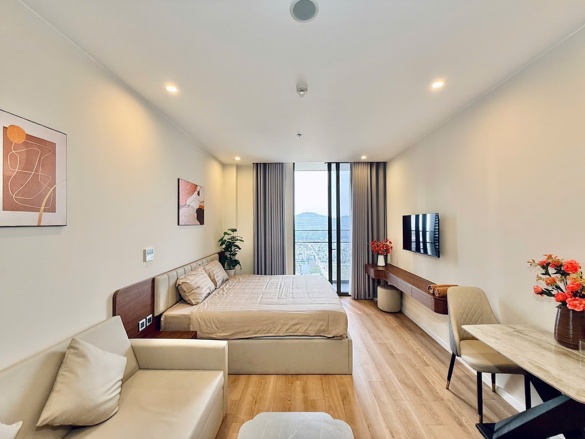 Ubicado junto al InterContinental Halong Bay Resort, este estudio de 45 metros cuadrados totalmente amueblado con impresionantes vistas al mar de la bahía de Ha Long desde el piso alto. Es muy cómodo y ofrece servicios completos para relajarse, entretenimiento y comida a un precio exclusivo para los huéspedes que se alojan aquí, y está ubicado perfectamente en la hermosa playa. Nota: La piscina, el jacuzzi, el gimnasio, el spa y el desayuno están disponibles por un cargo adicional y son administrados por el hotel 5★ À La Carte. Las entradas se pueden comprar en recepción a precios para residentes. Apartamento con licencia