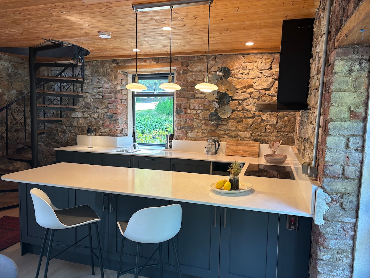 A beautiful traditional stone built barn converted into a contemporary/industrial/rustic living space with quirky touches. Located in the idyllic foothills of the Wicklow Mountains, on the Wicklow Way, it features an open plan kitchen/living/dining space, a mezzanine bedroom and a spacious wet room. An extension offers an additional boot room/rustic bathroom/loo and paved courtyard. The grounds are comprised of upper and lower lawns set on half an acre. A country pub is within walking distance.