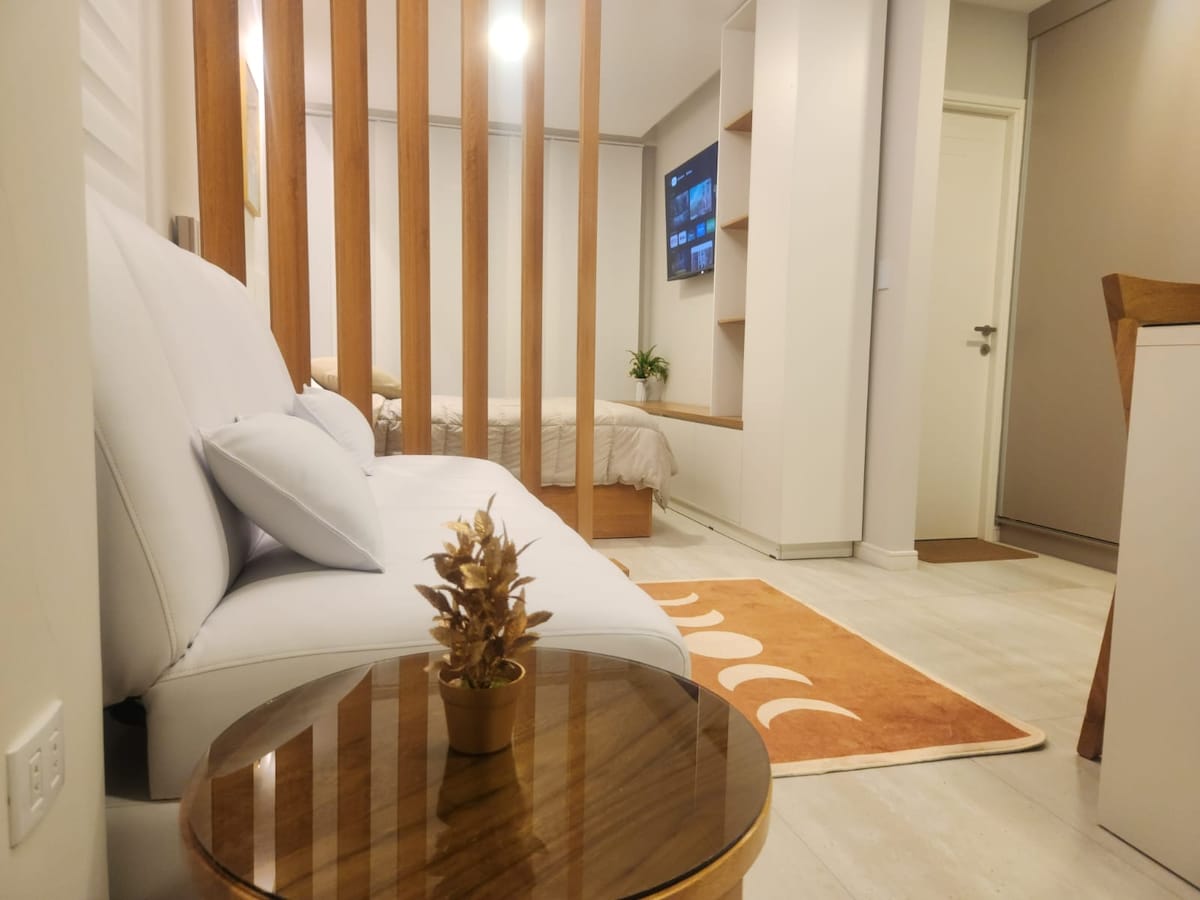 Hermoso monoambiente de lujo, con un hermoso balcón y vista a la ciudad, en la mejor zona de la ciudad, a pasos de Centros Comerciales, Supermercados, Restaurantes, Cines, Discotecas y Bares. Ideal para conocer la ciudad y sus principales atractivos o para viajes de trabajo. Tiene cocina, frigobar, tv, Wifi, microondas, un sofá cama, (opcionalmente, cuna, bañera y accesorios para bebe). y Adiciolmente el edificio cuenta con un cowork de lujo.