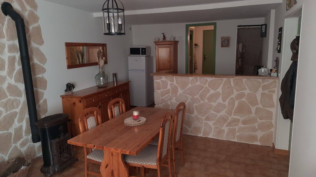 Esta casa consta de: - una cocina equipada con horno, microondas, placa de inducción, nevera pequeña, hervidor de agua, cafetera y tostadora - un baño con ducha, lavabo, inodoro, lavadora - una zona de dormitorio de 2 plazas (160 x 200 cm) abierta - una sala de estar comedor y sala de estar con sofá cama de 2 plazas - Disponibilidad de una cuna si es necesario Se proporcionan sábanas y toallas. Estufa de leña y piscina. Gastos de limpieza a pagar a la llegada: 50 euros