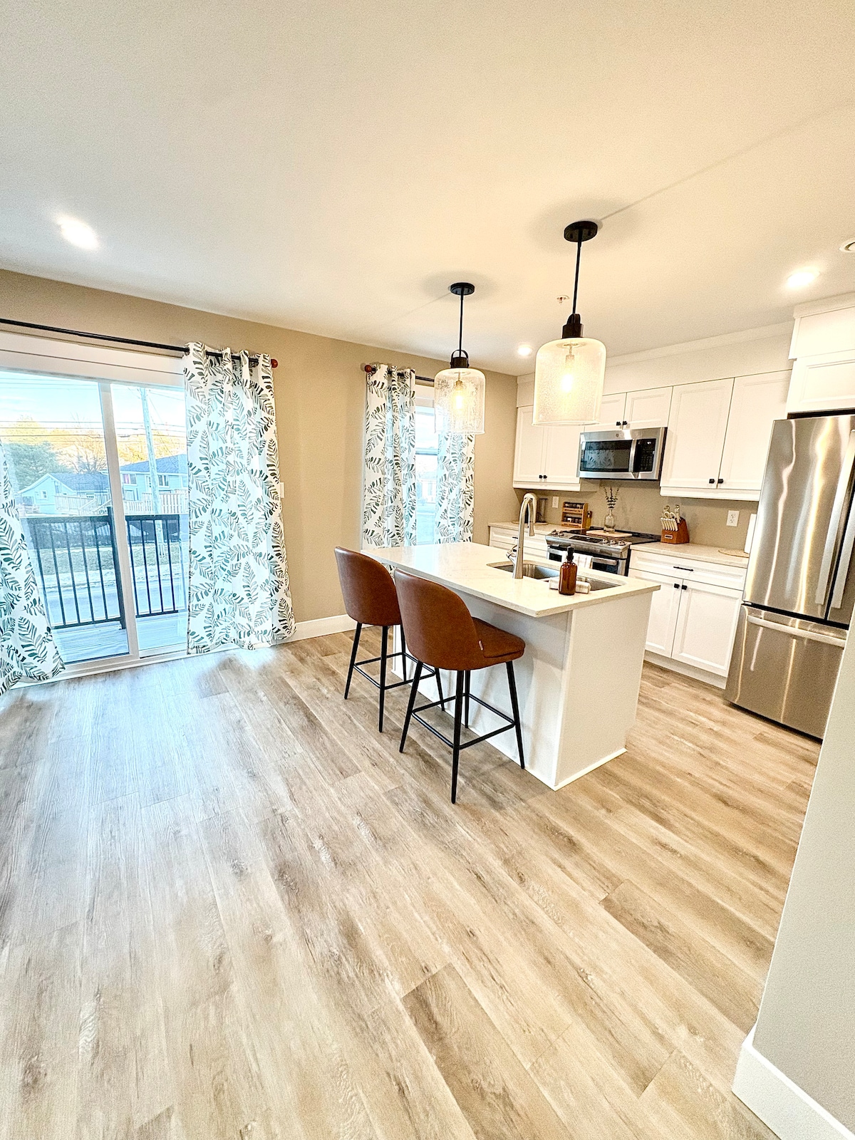 Relájate en este elegante espacio. Uno de los dos alojamientos de corta duración en este lugar. La cocina tiene una cafetería, un fregadero de una granja y una despensa. La pared shiplap de la sala de estar alberga un televisor de 55pulgadas y una chimenea eléctrica. También tiene un sofá cama. Con 2 dormitorios, 11/2 baños, esta unidad tiene capacidad para 4 personas. El espacio al aire libre se construyó para el entretenimiento, la gran cubierta está parcialmente cubierta para que puedas disfrutar en un día lluvioso. Fogatas de propano y leña. Camina a restaurantes, bares,mercados y tiendas. Admite mascotas