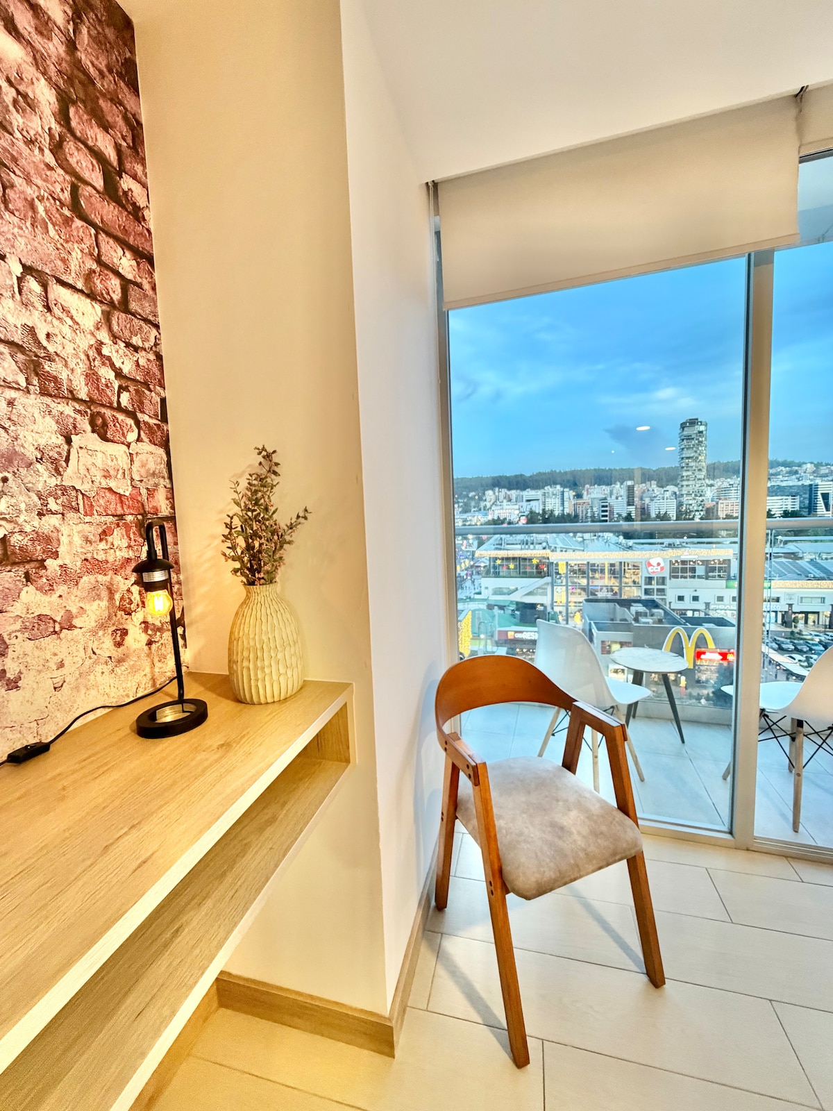 Disfruta y relájate en nuestro lujoso apartestudio, ubicado en el sector financiero de Quito. Desde el 17mo piso del icónico Edif. One, podrás levantarte con la mejor vista del amanecer. El edificio cuenta con exclusivas áreas sociales: piscina, zonas húmedas y gimnasio, para una visita inolvidable. El apartamento está pensando en tu comodidad, en él encontrarás lo necesario para una estadía agradable y placentera: WiFi, cocina equipada, TV con Netflix.