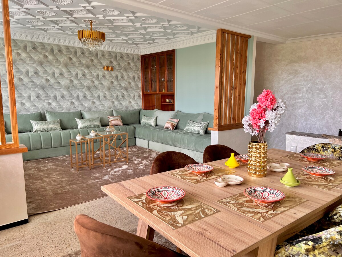 Hermoso apartamento de dos dormitorios totalmente renovado con un toque marroquí y moderno Ofrece una impresionante vista al mar desde el balcón y todas las habitaciones . La residencia se encuentra a lo largo de la corniche de Rabat, que ofrece fácil acceso a restaurantes y frente a la playa tiendas a poca distancia, Y a pocos minutos en coche de la estación de tren Rabat Agdal. Aparcamiento privado gratuito conexión de alta velocidad. Cocina totalmente equipada. Aire acondicionado en la sala de estar