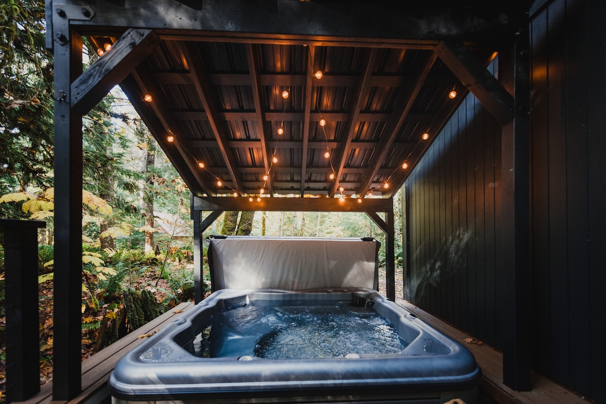 Private. Peaceful. Romantic. Designed for unforgettable getaways. Escape to your own secluded spa cabin just minutes from Mount Rainier NP. After a day of adventure, return to your private hot tub, custom cedar sauna, and fire pit beneath the forest canopy. Thoughtful details, cozy lighting, a fully stocked kitchen, coffee bar, games, and streaming make it easy to settle in and stay awhile. Many guests return year after year for anniversaries, birthdays, and quiet resets!