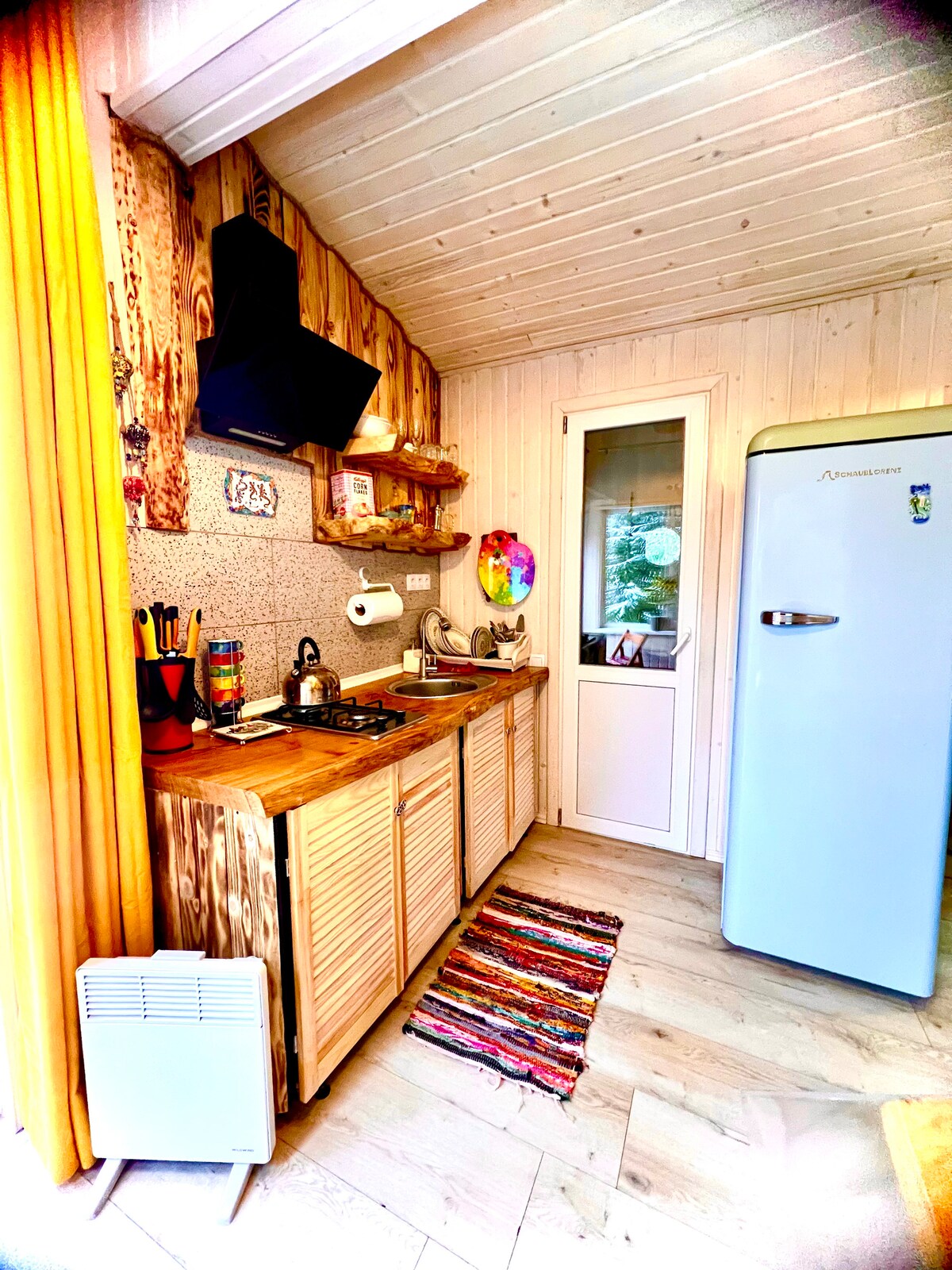 Ticho es un espacio único ubicado en la cima de una montaña. Está rodeado de vistas increíbles: Hoverla, Petros, Dragobrat, picos que se pueden ver directamente desde la ventana. Debido a su ubicación remota, intimidad y ambiente especial, unas vacaciones en TiHo se convirtieron en una verdadera experiencia de reinicio para personas de diferentes partes de Ucrania. Hay tres casas en el territorio del espacio: una cabaña de retiro, una pequeña casa de granero y TyHo hutka, esta es la que alquilamos, y esta es la que ves en la foto.