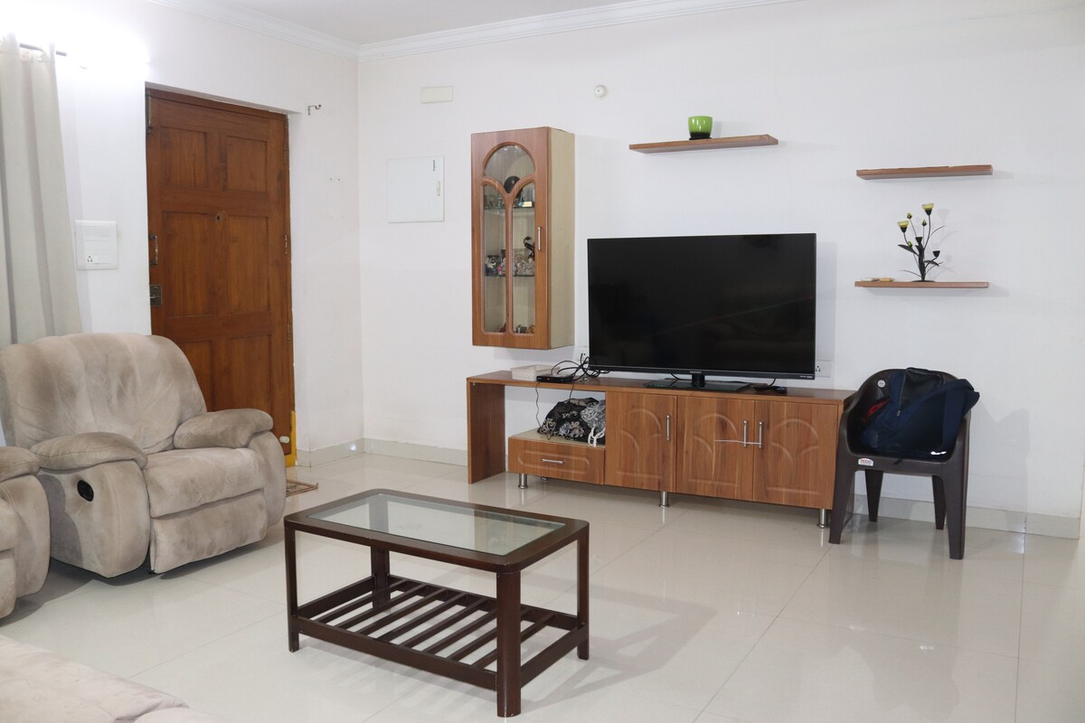 Para consultas @@ ** No se permiten parejas no casadas ** Este es un acogedor apartamento de 180 pies cuadrados de 1 dormitorio y 1 baño ubicado en la planta baja. Se encuentra en la ubicación más céntrica de Vizag. A poca distancia a pie de la estación de autobuses, centros comerciales, cines, restaurantes y CMR Central. Ofrecemos una cocina totalmente equipada, dormitorio con aire acondicionado y una pequeña área de dibujo con un escritorio. Es el más adecuado para viajeros familiares con niños/bebés, viajes de negocios y estudiantes que requieren estancias cortas.