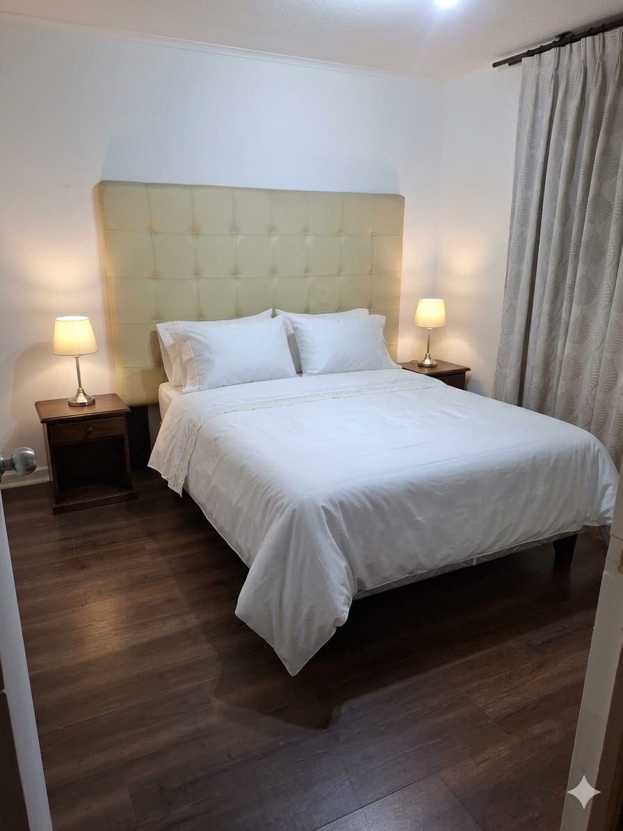 Disfruta de la sencillez de este alojamiento tranquilo y céntrico. A pasos de supermercados, restaurantes, excelente ubicación y locomoción a la puerta. Es condominio con vigilancia las 24hrs. Departamento con dos habitaciones y dos baños, habitación principal en suite, las camas son de 2 plazas. Living comedor, cocina full equipada con lavadora, secadora de ropa. Además de cocina, horno eléctrico y horno microondas, juego de ollas, servicio para 4 personas. Además consta de una amplia terraza.