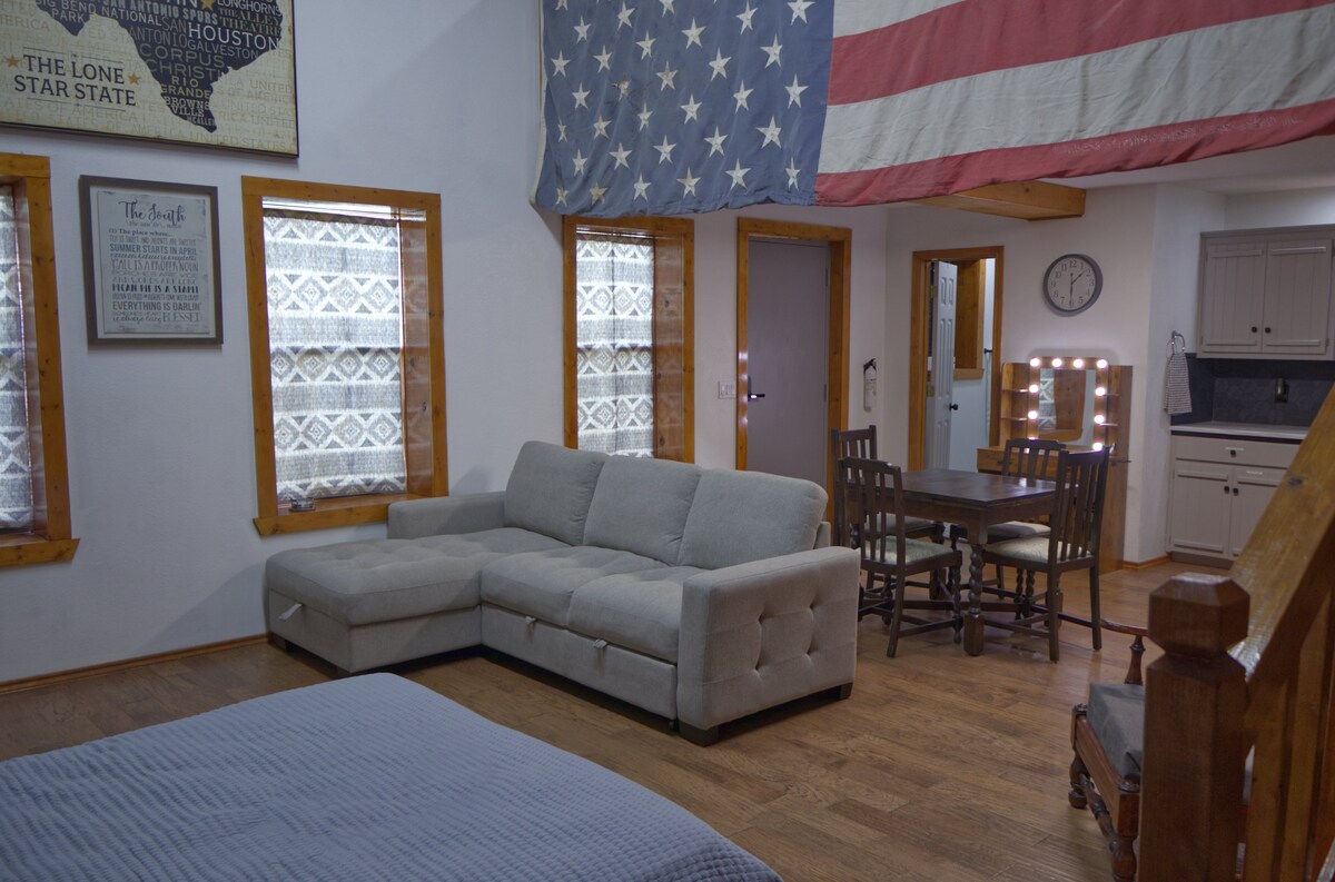 Combinación de lo antiguo y lo nuevo... Siéntete renovado cuando te quedes en esta joya rústica. En la SC pueden dormir 4 personas cómodamente. La cocina americana está equipada con cafetera, tostadora, hervidor eléctrico, microondas y refrigerador. El baño tiene comodidades adicionales en caso de que olvides algo. La ducha, que tiene tuberías de cobre expuestas, seguramente impresionará. Afuera hay un pequeño patio con sillas adirondack y fogata de gas que dan al pasto del ganado y las impresionantes puestas de sol de Panhandle.