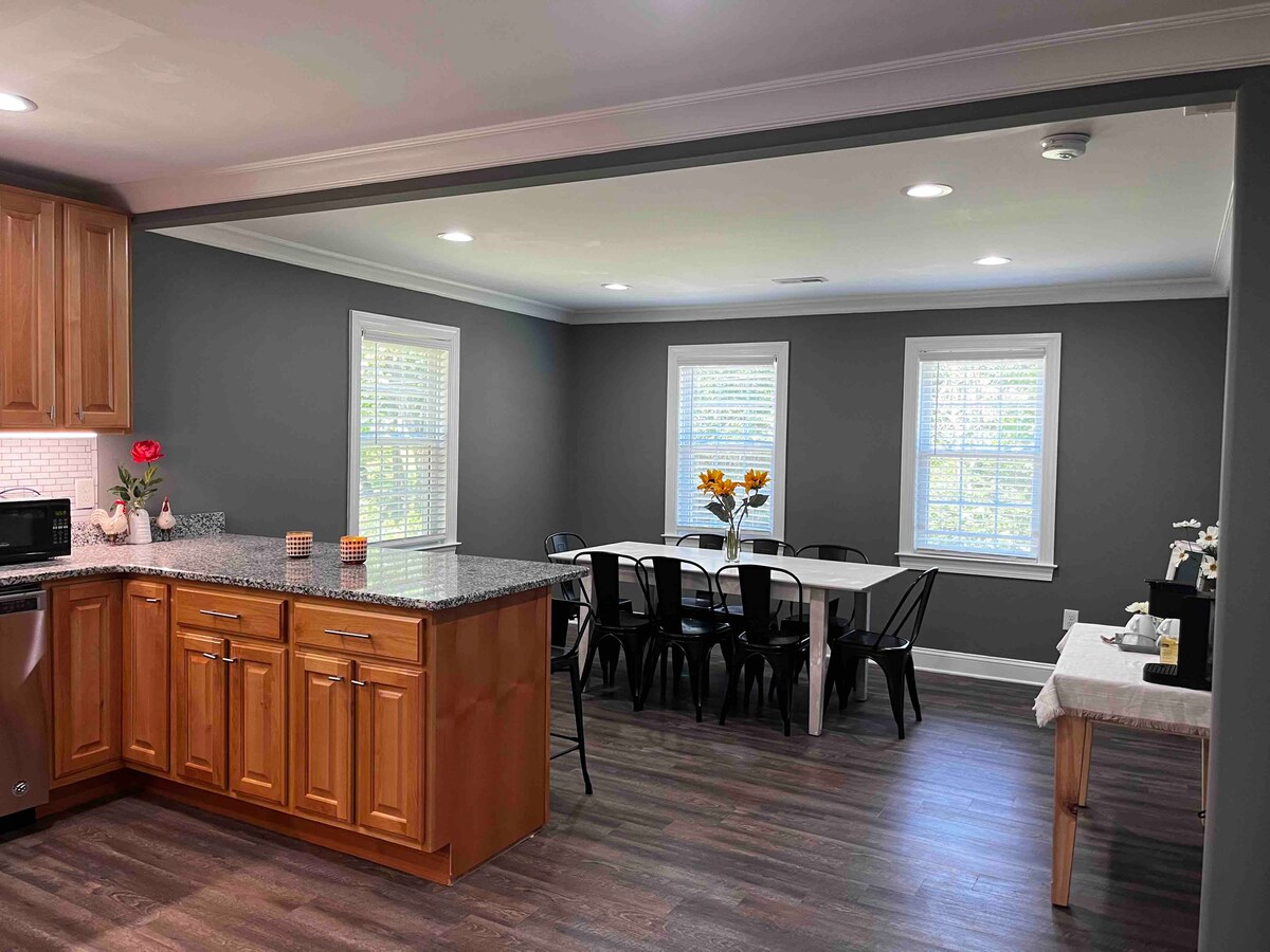 ¡Zoológico y complejo deportivo de NC a <10 min. de distancia! ¡Cómodo y agradable! - ¡Casa renovada y casa de juegos para niños al aire libre! - Los trabajadores remotos son bienvenidos. - Gran sala de juegos con mesa de hockey de aire de 7'. - Solárium con cama completa y persianas opacas - Amplia sala de estar, comedor y oficina en casa. - Cocina totalmente equipada para cocinar, aperitivos/café/tés incluidos - 3 televisores grandes de alta definición con Chromecast, Roku y TV Spectrum, Home Assist. - Terraza con parrilla, sillas, mesas de picnic - Precioso anillo de fuego de piedra, círculo de sillas Adirondack, bosque privado.