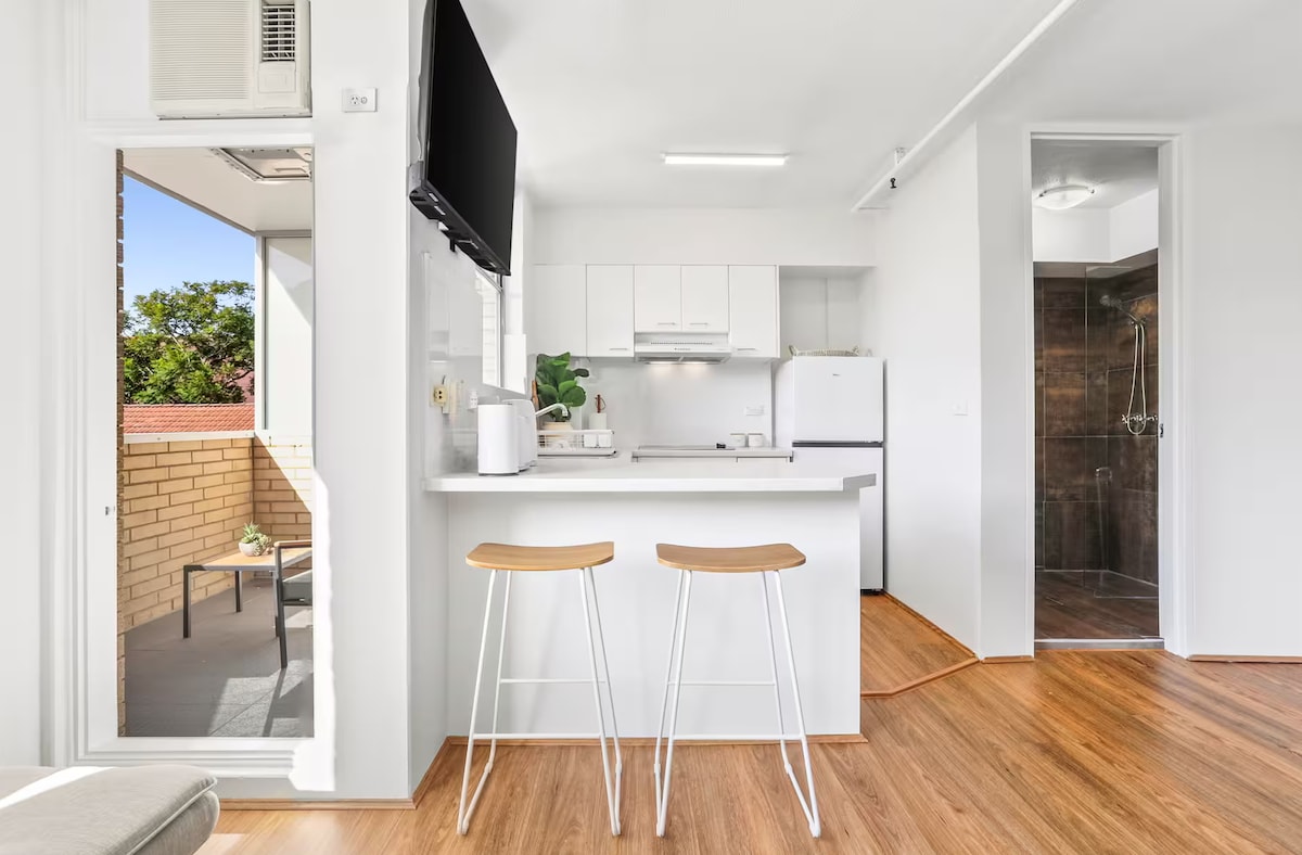 Mi elegante apartamento de 1 dormitorio se encuentra en Hall St, en el corazón de la playa Bondi de Sídney. Está rodeado de cafeterías, bares, restaurantes y, por supuesto, la playa. Te encantará este apartamento de tan buena calidad. A ✔ 5 minutos de la playa. ✔ Balcón con barbacoa y silla Egg Chair. ✔ Ascensor ✔ Colchones de Sealy (marca de calidad). ✔ Toallas, edredón, almohadas de Sheridan. Wifi NBN✔ rápido e ilimitado. Luces ✔ Nanoleaf. Cocina ✔ Totalmente Equipada Cafetera ✔ Nespresso + Nutribullet ✔ Garantía de satisfacción (Superanfitrión)