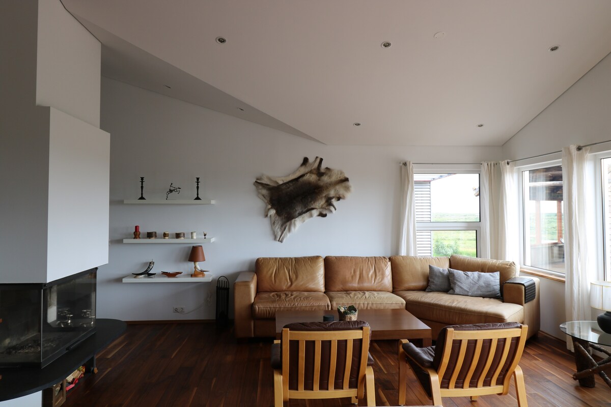Diviértete con toda la familia en este alojamiento con estilo. Está en el campo, por lo que podrás disfrutar de la naturaleza, pero aún así estar muy cerca de los lugares más populares de Islandia para que los turistas los visiten. ¡El círculo dorado, Thorsmork, la laguna Glacier y mucho más! La casa tiene todo lo que necesitas en tus vacaciones, tiene capacidad para seis huéspedes e incluye una barbacoa, chimenea y una bañera de hidromasaje para relajarte después de un largo día de explorar Islandia :) ¡Bienvenido a nuestra cálida y acogedora casa en el sur de Islandia!