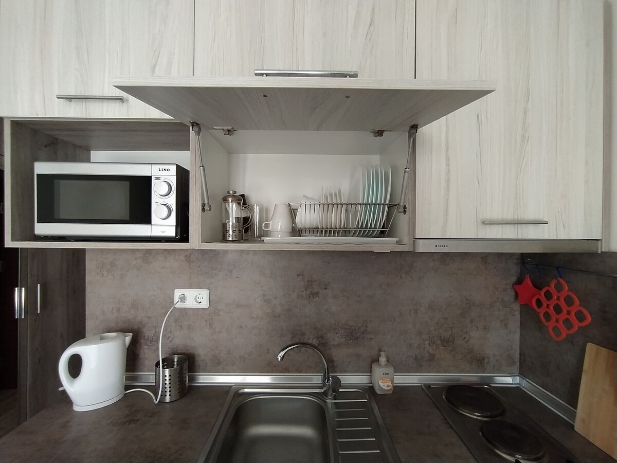 Acogedor apartamento en un edificio residencial, en las afueras de Nessebar. A 2 minutos a pie de la playa principal. Calle tranquila, pero el centro con cafeterías y tiendas está cerca (200 m). Minimercados, puestos de frutas y verduras cerca. A Nesebar (ciudad vieja) 4,5 km, 20 minutos en autobús urbano o 5-10 minutos en coche. Dormitorio y salón con cocina, logia. Un baño con ducha. 2 aires acondicionados. La cocina está equipada con todo lo necesario para una estancia cómoda. No se puede fumar. Alojamiento sin mascotas.