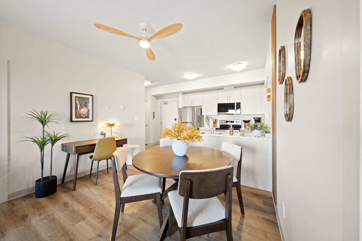 Adéntrate en la comodidad, el carácter y el encanto de esta moderna suite retro de 2 dormitorios/2 baños (2 camas tamaño king), perfectamente ubicada en el vibrante distrito de Capstone de Red Deer. Ubicado junto al río Red Deer con vistas panorámicas, senderos para caminar y cafés a solo unos pasos, esto es más que un lugar para alojarse: es un ambiente. La suite combina modernos toques retro con la facilidad de las comodidades actuales. Tanto si estás aquí para explorar, relajarte o trabajar a distancia, te encantará el diseño acogedor y espacioso, la decoración y el ambiente.
