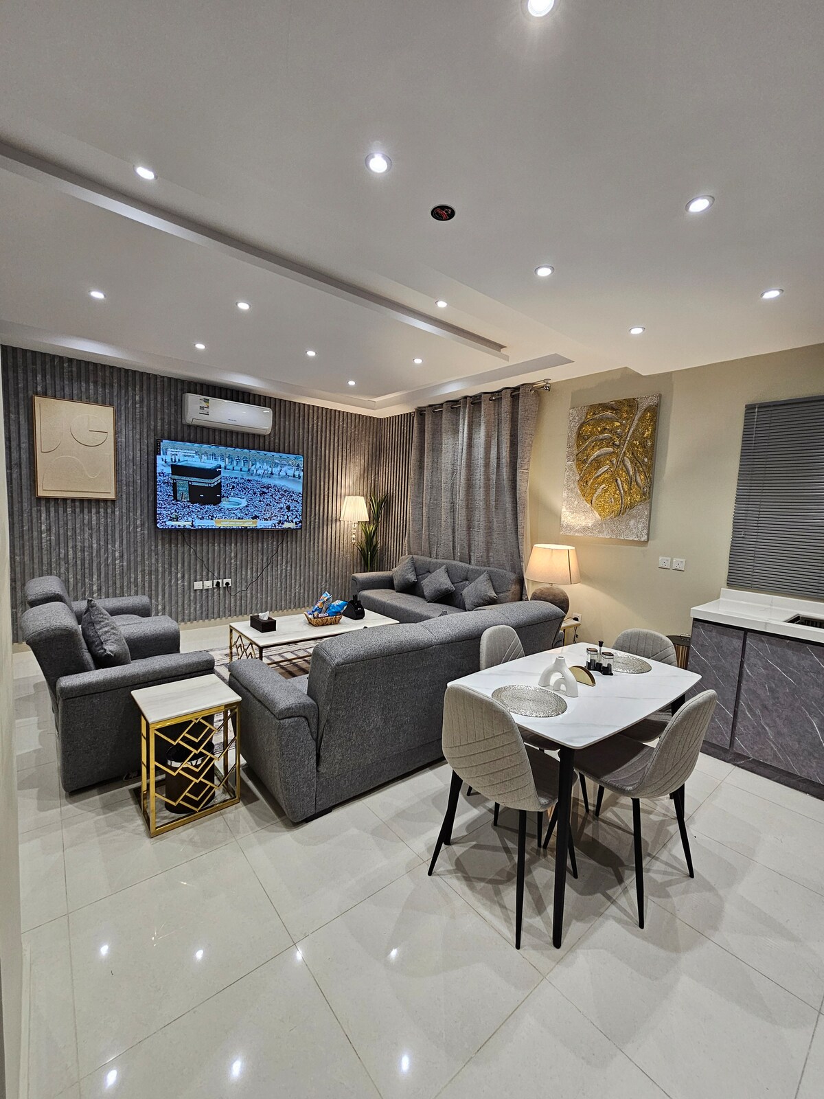Disfruta de una estancia elegante y sofisticada en el corazón de Yeda, en un apartamento de hotel con vistas a la torre Shangri-La y en King Abdulaziz Road, uno de los lugares más vibrantes y distintivos de la ciudad. Más información del departamento: • El diseño contemporáneo de lujo ofrece la máxima comodidad • Dormitorio elegante y cómodo • Amplia zona de estar equipada para relajarse o trabajar Características del alojamiento: • Registro de entrada autónomo mediante un código electrónico para garantizar la privacidad y la accesibilidad • Ascensor en el edificio para facilitar los desplazamientos • Wifi de alta velocidad • Ubicación céntrica cerca de los restaurantes, cafés y lugares de interés más destacados