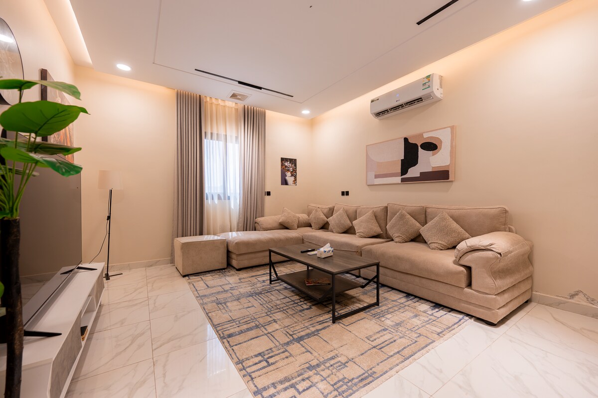 Apartamento de lujo, tranquilo y espacioso en un edificio residencial nuevo. Hay un ascensor para facilitar el acceso a la vivienda, entrada independiente y alta privacidad. Hay un empleado para atender a los huéspedes durante la estancia para entregar los pedidos y limpiar a diario. (Wifi de alta velocidad disponible en la vivienda) (supermercado, lavandería) y aparcamiento privado para 2 coches Tenemos una pantalla de entretenimiento de 65 pulgadas Con suscripción a Netflix 📺 Ver TV 📽️ Cerca de Abhur 🌊 10 minutos Cerca del aeropuerto de Jeddah ✈️ 15 minutos Cerca del estadio Al-Jawhara 🏟️ 4 minutos Cerca de Superdome Jeddah Dome 🎉 6 minutos