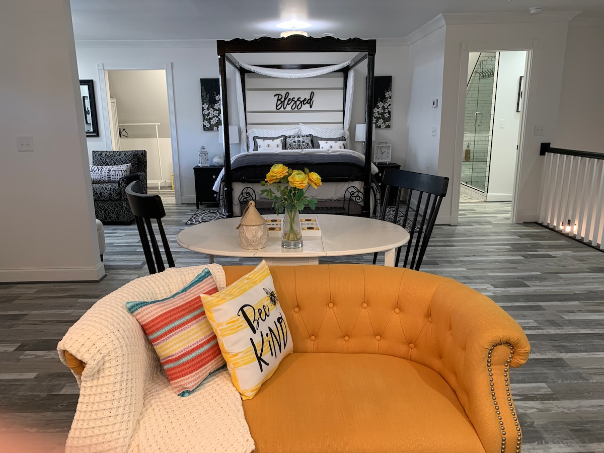 Acomódate en Little Farm, al pie de los Apalaches. Perfecto para parejas y profesionales que viajan, nuestro sótano privado tiene una entrada independiente para vehículos, cama tamaño king y baño completo. Cómodo sofá y sofá cama reclinables, TV inteligente HD de 70 pulgadas con barra de sonido con Netflix y Amazon Prime, wifi, nevera, microondas, barra de café con cafetera Keurig y mesa de bistró. En el exterior, disfruta de las vistas de Little Farm de nuestro rebaño bajo la hermosa Magnolia, con chimenea y silla mecedora.