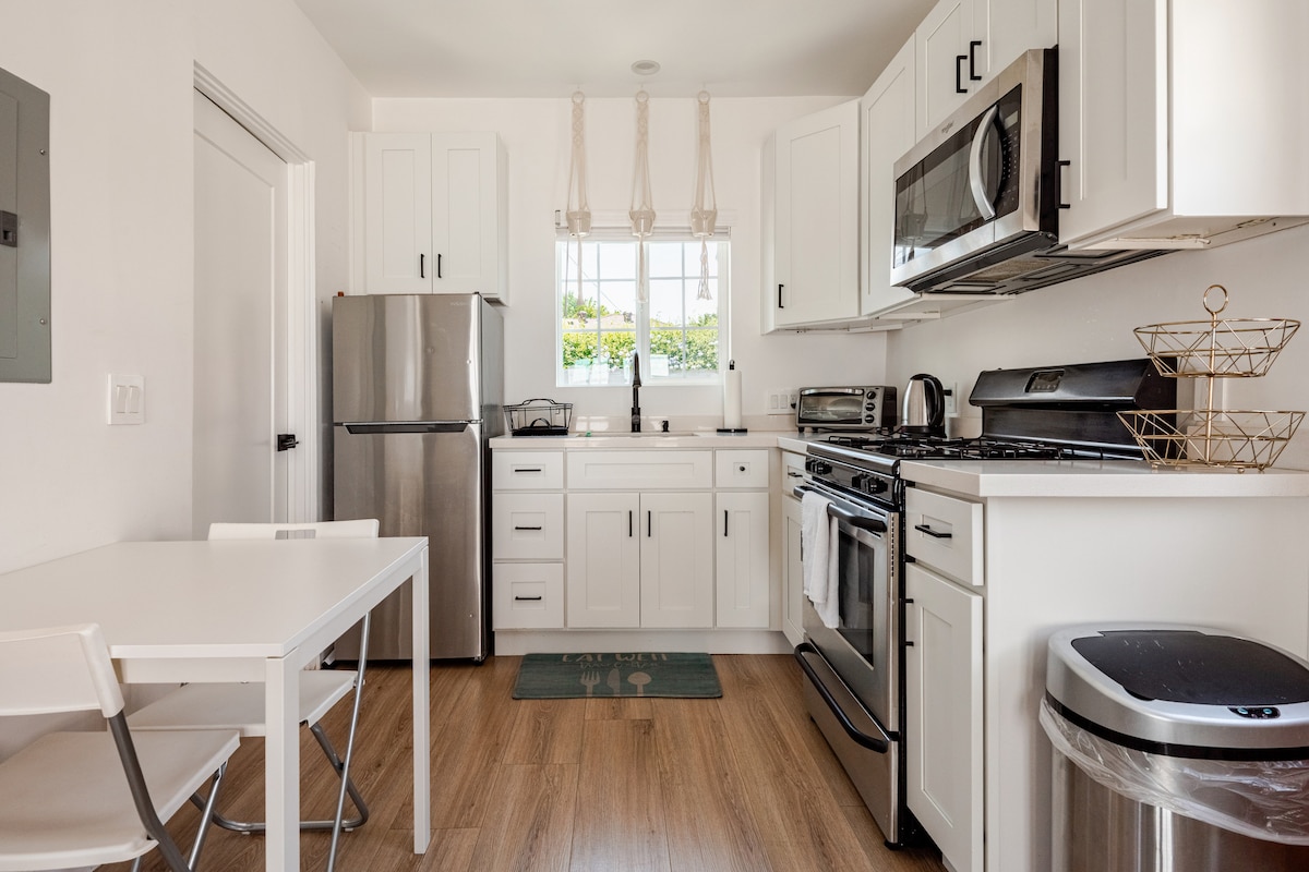 Retiro privado con entrada propia y estacionamiento en propiedad cerrada. Suite estudio de 1 dormitorio con baño tipo spa y minicocina. Cama tamaño queen con sala de estar y patio jardín. La unidad está semiadherida a la casa principal pero es completamente privada con entrada/patio independiente. * Barra de café/té * Se proporcionan aperitivos de bienvenida * Esterilla de yoga y pesas de mano. * Registro de entrada sin contacto * Immaculadamente limpio. Cómodo local de SFValley a minutos de la estación Van Nuys Flyaway hasta LAX, estaciones de Amtrak/Metro y todas las autopistas.