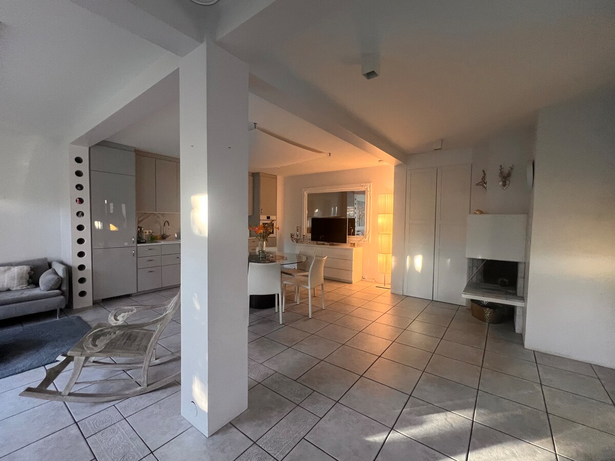 Bienvenido a mi tranquilo y espacioso loft, un alojamiento real perfecto para una pareja que busca relajarse durante unas noches. Con dos balcones, una ducha a ras de suelo, altavoces de varias habitaciones, una cocina totalmente equipada y una cama tamaño king muy cómoda, tendrás todo lo que necesitas para una estancia relajante en este tranquilo vecindario. He cambiado un poco la disposición del salón, nada grave, solo lo he hecho más cómodo (he reorganizado el sofá, el proyector, la estantería, etc.).