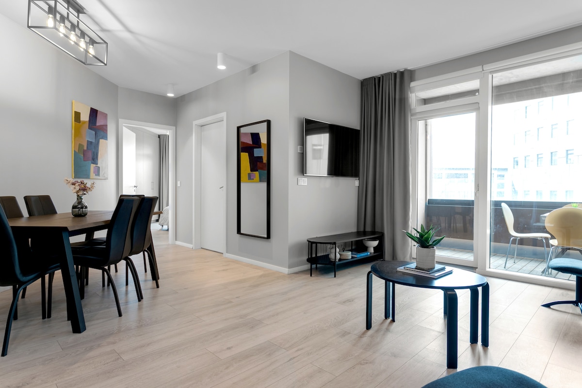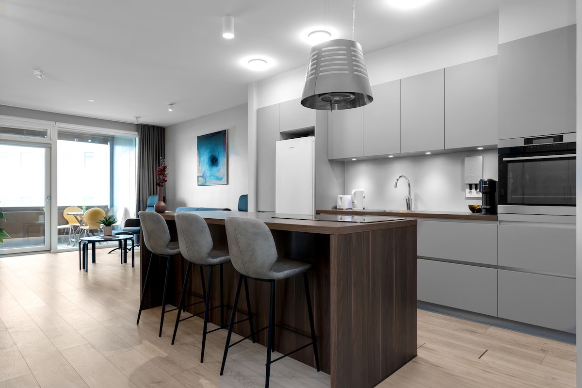 El alojamiento está situado en el centro para que todo el grupo pueda desplazarse fácilmente. Apartamento de 468 pies cuadrados que está bien situado y es moderno y espacioso. Cerca de tiendas, restaurantes y cafeterías. TV Samsung Qled de 65 pulgadas. Red inalámbrica gratuita. Cama Serta y sofá cama adecuados para 2 adultos. La cocina cuenta con fogones, horno, microondas, tostadora, olla a presión, cafetera Nespresso y todos los utensilios. Apartamento nuevo en una ubicación tranquila en el centro de la ciudad. Parada de Flybus.
