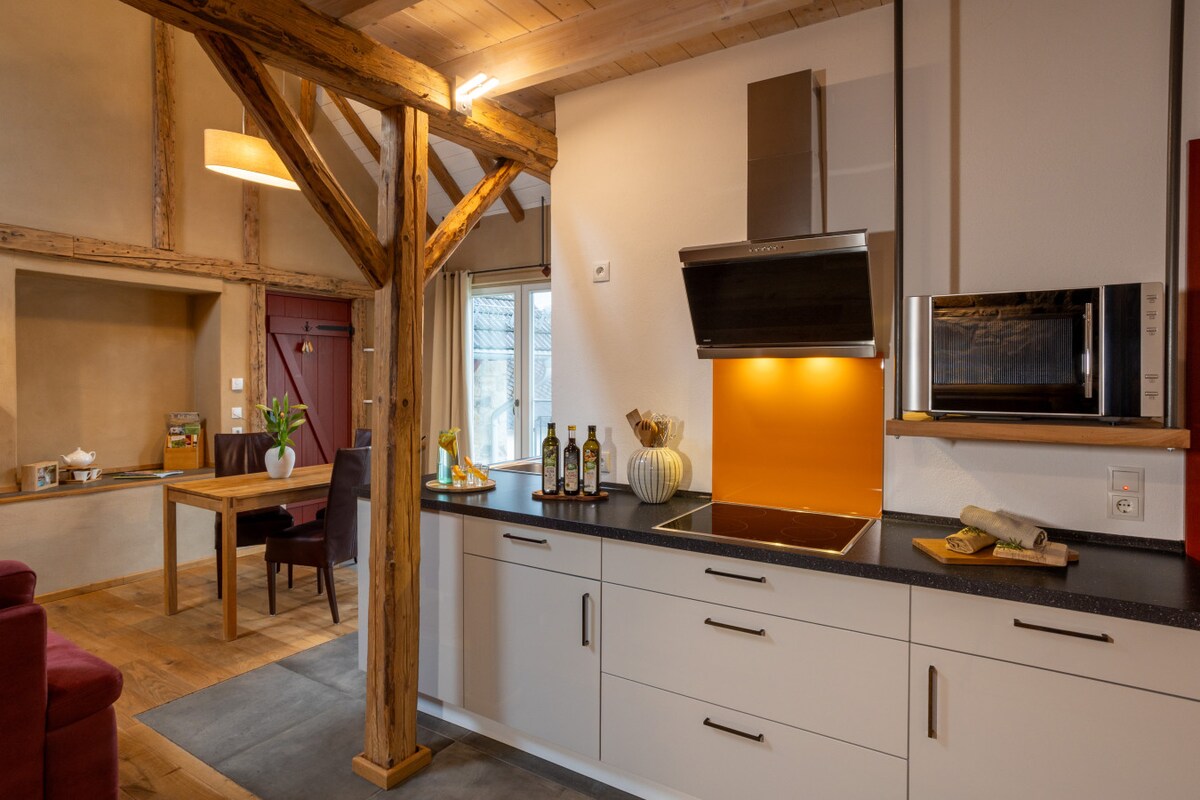 Descubre el Rheingau y alójate en nuestro espacioso granero de estilo loft con un acogedor patio (con aparcamiento para tu coche) en el tradicional distrito de Johannisberg. El mundialmente famoso castillo de Johannisberg está a 250 m y la ruta de senderismo de larga distancia Rheinsteig pasa a 400 m. Varias bodegas con tabernas de finca o tabernas de vino están a poca distancia.