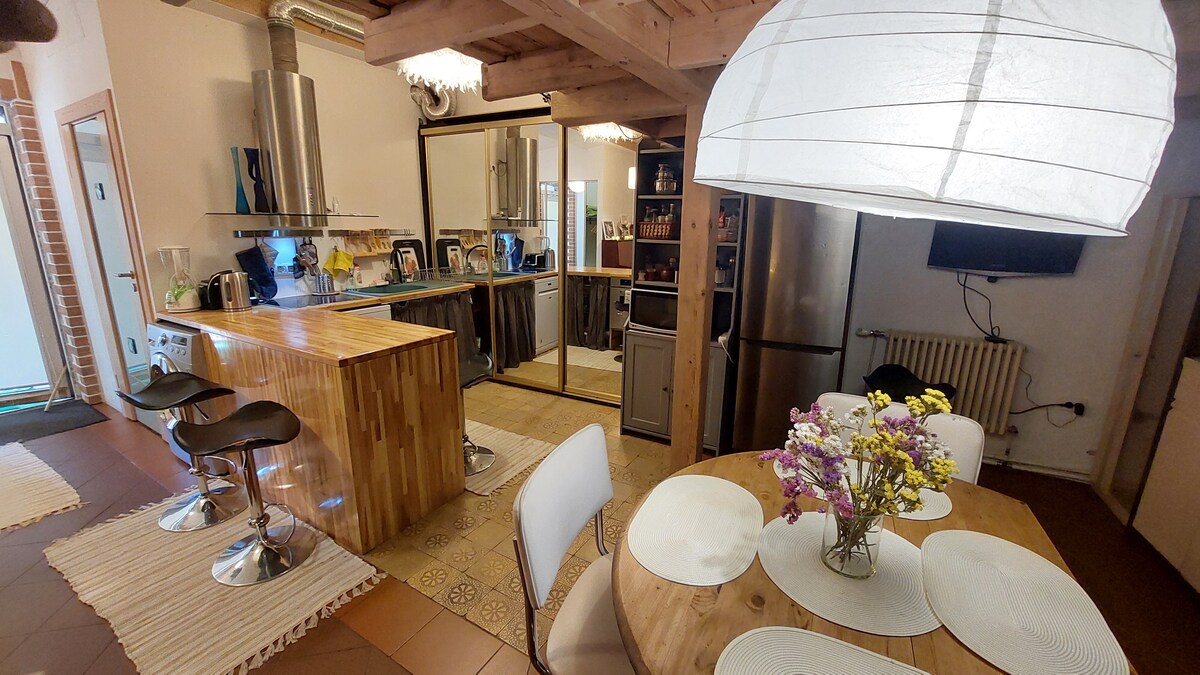 Elegante estudio de 2 pisos en el centro de Rīga con estacionamiento GRATUITO, WiFi y patio privado. Cocina totalmente equipada, sala de estar con TV, baño con bañera y lavadora. Junto al parque Ziedoюdārzs, el skatepark infantil y la pista de bombas, el minigolf interior y la acogedora cafetería de pizza. Tranvía directo al casco antiguo cercano. Toallas y sábanas incluidas. Vista tranquila al patio. Ideal para parejas o viajes de negocios. Prohibido fumar en el interior.