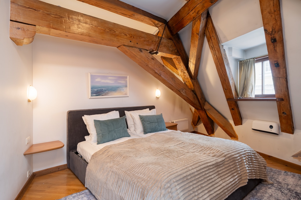 El apartamento se encuentra justo en el corazón del casco antiguo de Riga. Su departamento ejecutivo de 4 habitaciones con 2 baños en suite y sauna. El apartamento estaba equipado con 5 ventanas de vidrio gruesas para aislar el ruido exterior y darte la mejor experiencia posible. Su propiedad moderna recién renovada se construyó en diciembre de 2023.