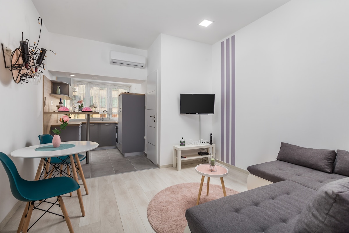 Situado en el centro de la ciudad, hermoso y moderno apartamento nuevo amueblado y engañoso con un dormitorio y la sala de estar, cocina, baño y balcón. Con aire acondicionado, wifi y TV inteligente. El apartamento te ofrece comodidad y una ubicación ideal para descubrir Rijeka. No hay aparcamiento designado, ya que se trata de un centro de ciudad europeo. Hay varios garajes y aparcamientos en superficie a muy poca distancia a pie. Busque Parging Korzo, Parking Riva o Garaza Zagrad.