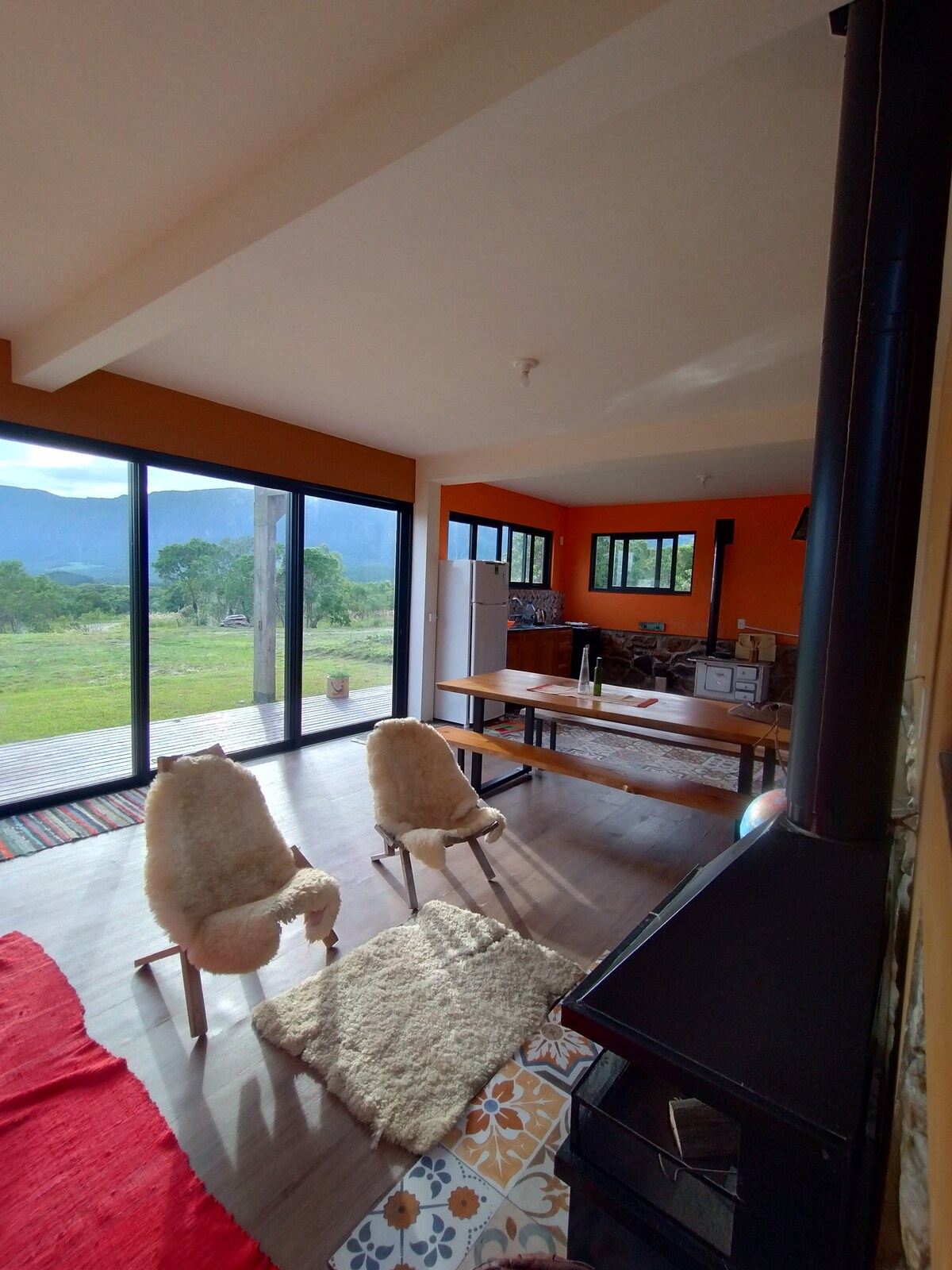 Un lugar para relajarse. Cabaña con vista panorámica donde podrás sentir y estar en la calidez de la naturaleza. Ideal para estar con la familia y los amigos. Bosque nativo, ríos, manantial, cascada, árboles frutales, huertos, céspedes, etc. Estufa de leña para disfrutar de las frías noches de invierno. Y terraza para disfrutar del sol naciente y el aire fresco del verano. Clima perfecto en cualquier estación. Lugar de descanso y tranquilidad en medio de la naturaleza con un sendero por el bosque hasta el arroyo.