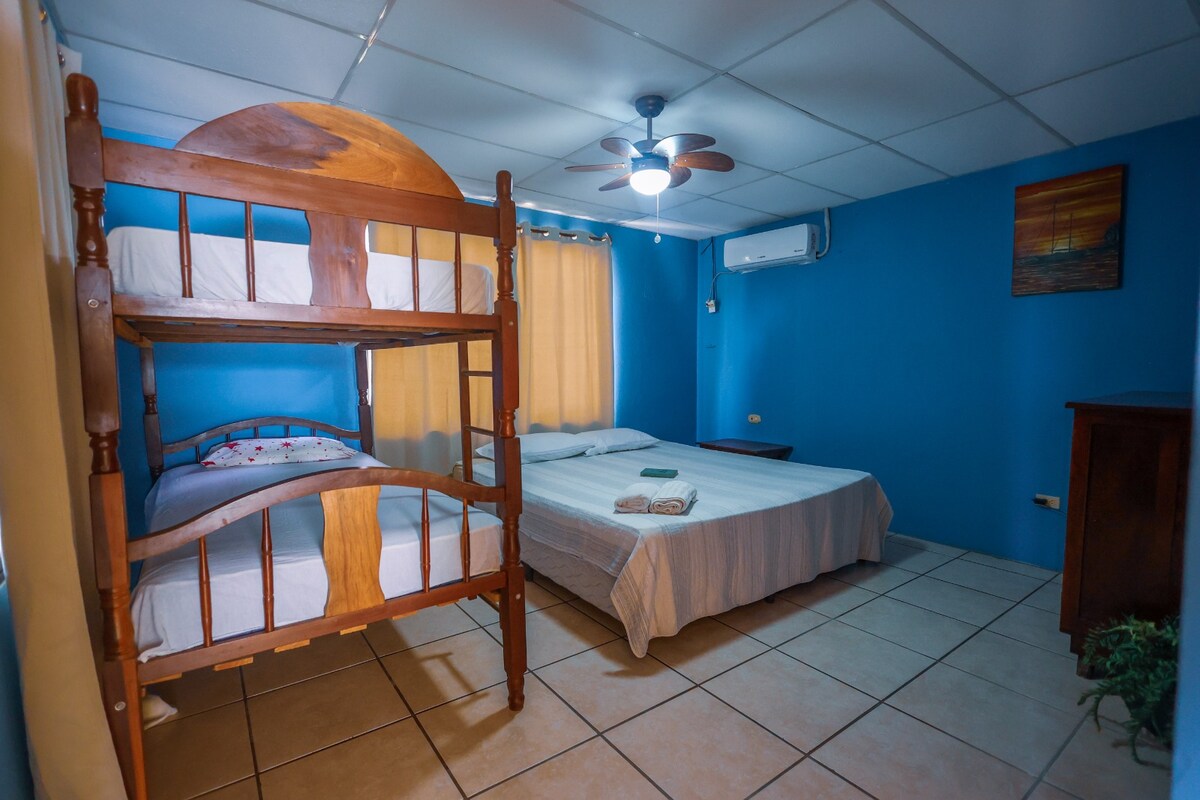 Habitación cuádruple con baño privado. Esta habitación posee una cama King y una litera unipersonal, AC, baño con agua caliente. Es una habitación ideal para familia o grupo de amigos, acogedora que permite que disfrutes de la tranquilidad de estar cerca de todo pero lejos de la bulla. El desayuno no esta incluido sin embargo puedes agregar un rico desayuno típico al hacer tu check in por un cargo extra.