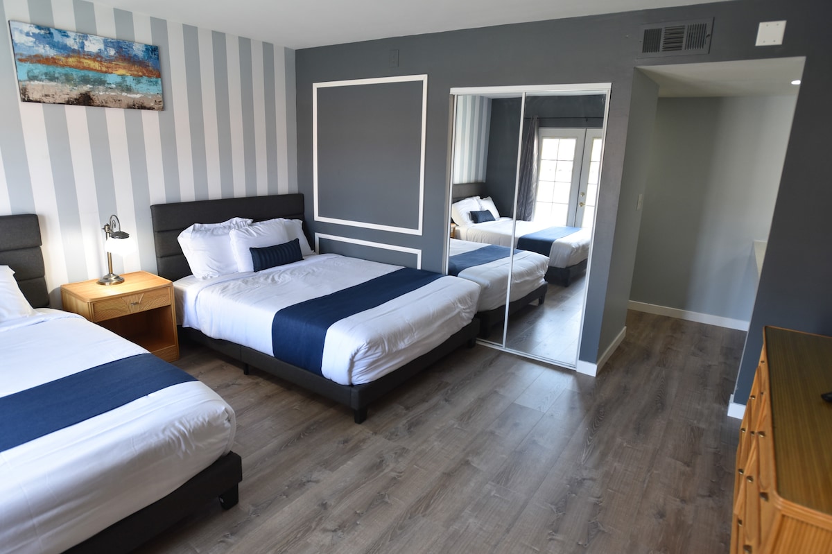 Recientemente remodelada, nuestra habitación Deluxe King cuenta con una cómoda cama tamaño king, un moderno baño con ducha a ras de suelo y un gran televisor inteligente. Aprovecha el café en la habitación y la cocina completa disponible para tu comodidad. Sal a tu propio patio privado y sumérgete en la soledad y la relajación. El Ayuntamiento de Palm Springs ID #2567