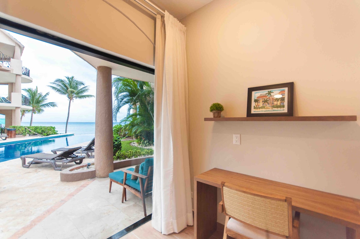 Apartamento de lujo recién remodelado y decorado frente a la playa en las hermosas playas del Caribe mexicano. Unidad de primera planta junto a la piscina infinita y a pasos de la playa. Vista al mar desde el dormitorio principal y la sala de estar. Ubicación perfecta en el centro de la ciudad, a solo media manzana de todos los restaurantes y tiendas de la famosa Quinta Avenida de Playa del Carmen.