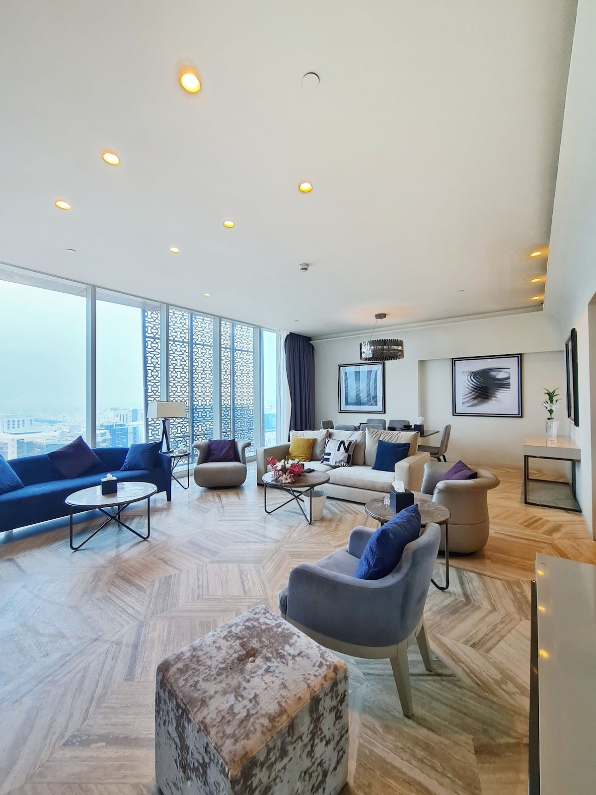 Apartment in Burj Rafal (owner's residence), 50+ floors, a northern view, for those looking for quiet and distinguished accommodation, near the most prominent landmarks of Riyadh. Fully equipped, designed and furnished with luxurious personal furniture; includes a bedroom with a master bed, a kitchen, (2) bathrooms. cinematic lighting, a washing machine, coffee machine, a 75-inch TV & large screen in the bedroom, air purifier filter, Kitchen tools to spend a period of stay in complete comfort.