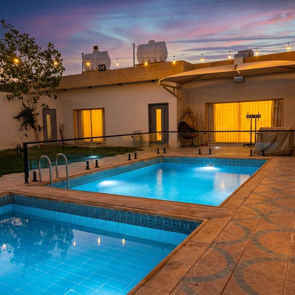 رقم تصريح وزارة السياحة: 52239 شاليه راقي يضم مسبح خاص، جلسات خارجية، مجلس أنيق، مطبخ متكامل، وغرف مريحة تناسب العائلة. يوفر لك أجواء هادئة وخصوصية تامة لقضاء أمتع الأوقات بعيدًا عن الضوضاء. جديد