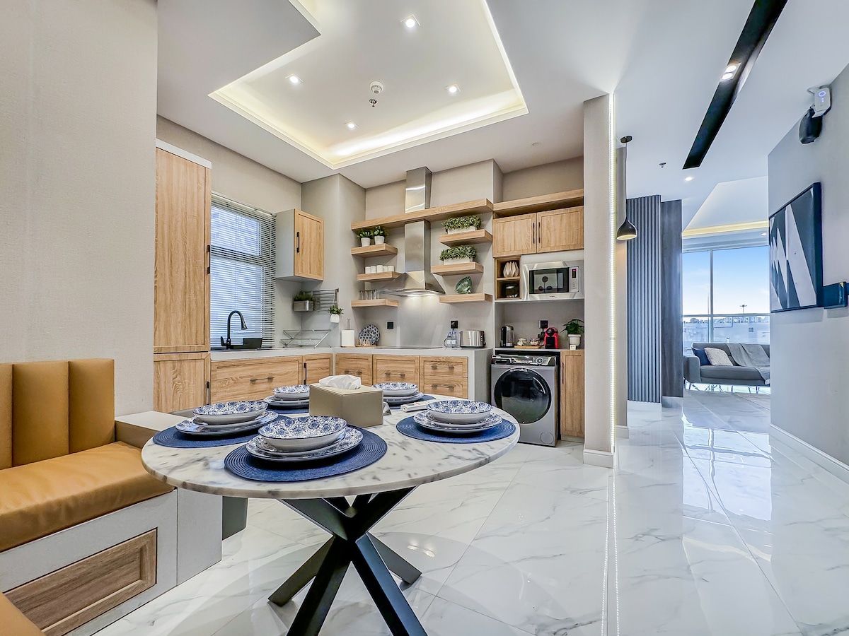 Moderno y elegante apartamento de 1 dormitorio en Al Malqa, a solo 10 minutos de Boulevard Riyadh City, Boulevard World & Kingdom Arena y a 8 minutos de Solitaire Mall. Disfruta de la comodidad de un hotel con una acogedora sala de estar, cafetera Nespresso, cocina completa, televisor inteligente, cama tamaño king, cuna, cama plegable y llegada autónoma. Aperitivos y bebidas gratuitos, wifi rápido, aire acondicionado, aparcamiento privado y fácil acceso a la cercana parada de autobús que conecta con el metro de Riad