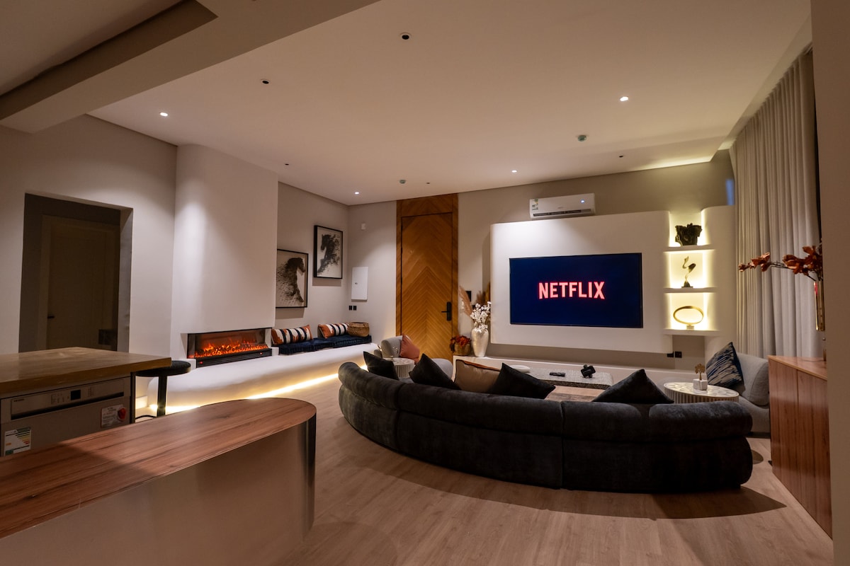Modern 1BR in Hittin, one of Riyadh’s prime locations, minutes from Boulevard City and top cafes. Designed for comfort and ease with self check-in and a full smart system. Features a cozy living area, comfortable bedroom, 85” Smart TV, and an elegant electric fireplace for a relaxing atmosphere. Fully equipped kitchen with oven, microwave, electric stove, dishwasher, and washing machine. Clean, stylish, and ideal for couples, business travelers, and short or extended stays.
