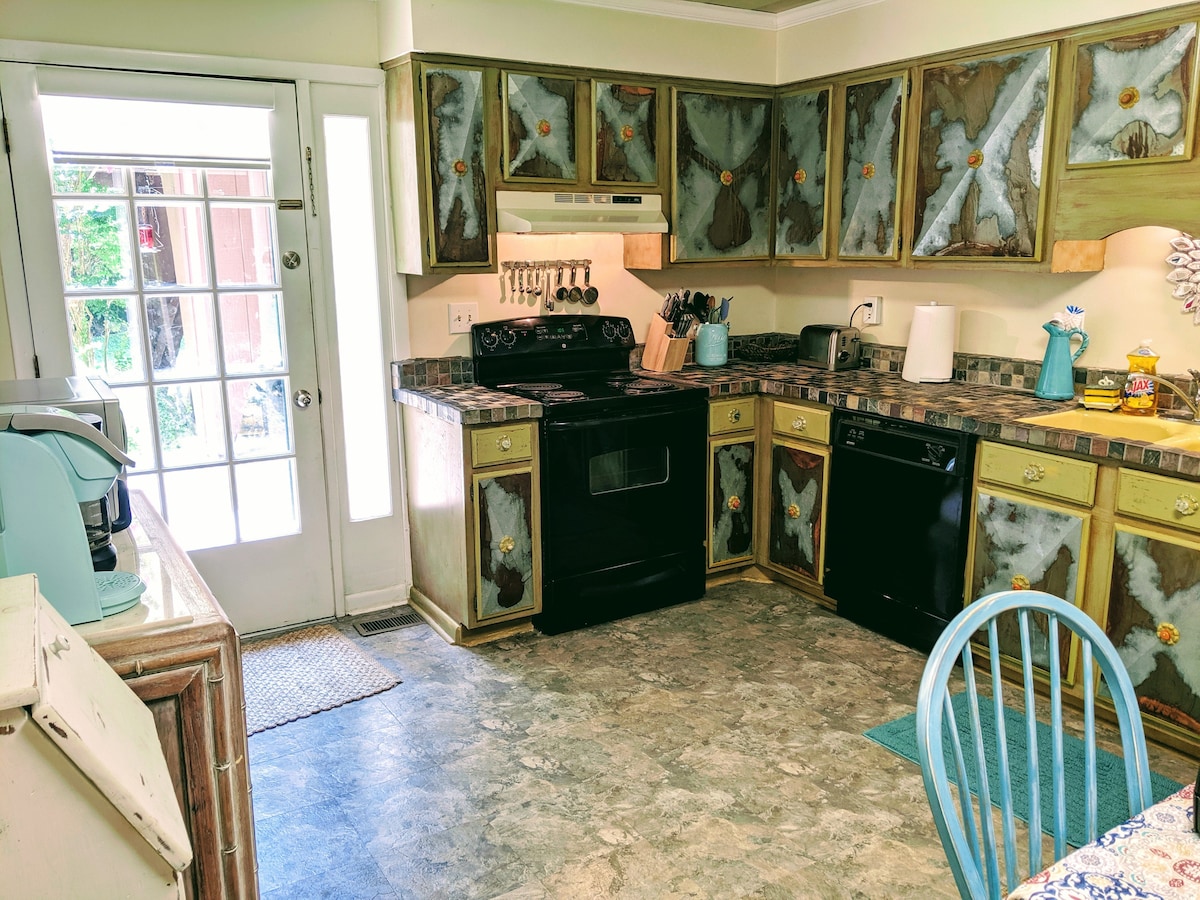 ¡Nuestra casa de campo es acogedora, privada y segura! Está totalmente equipada para que tu estancia sea lo más placentera y despreocupada posible. Tenemos wifi, 2 televisores con Roku, una radio Bose con CD, un reproductor de DVD con películas. Tenemos una estación de café con Keurig y cápsulas, un Mr Coffee con un molinillo de café. Cocina totalmente equipada. Combo bañera/ducha. Mucha privacidad en tu propia terraza trasera. Es posible que veas ciervos y pavos salvajes. Se proporciona parrilla de gas. Mucho aparcamiento. NO SE ADMITEN MASCOTAS.