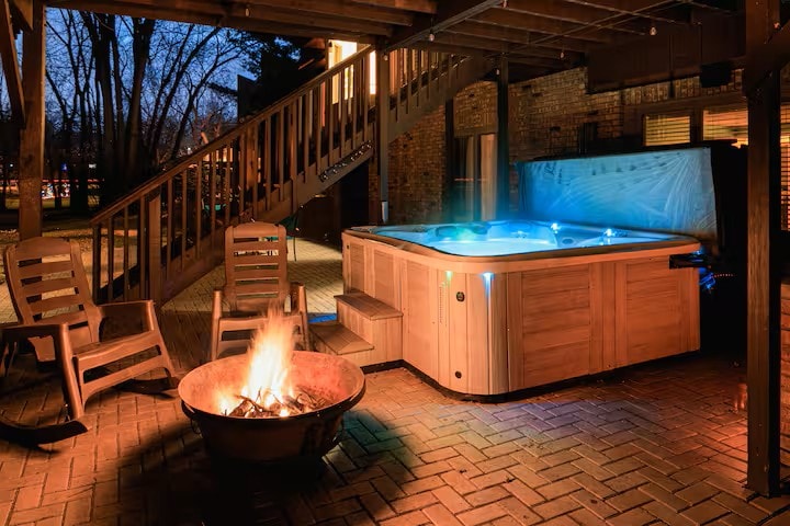 Ubicado sobre el río Rock, The Ravines es un refugio moderno con forma de A diseñado para un descanso profundo y la reconexión. Las ventanas de piso a techo, los tonos cálidos de la madera y las vistas al río crean un ambiente tranquilo. Relájate en la bañera de hidromasaje de cedro o en la sauna de barril, reúnete junto a la mesa de fuego o disfruta de la sala de juegos vintage. Con 5 habitaciones tamaño king, Wi-Fi rápido y un muelle privado con kayaks (según la temporada), esta es una escapada tranquila a solo 90 minutos de Chicago.