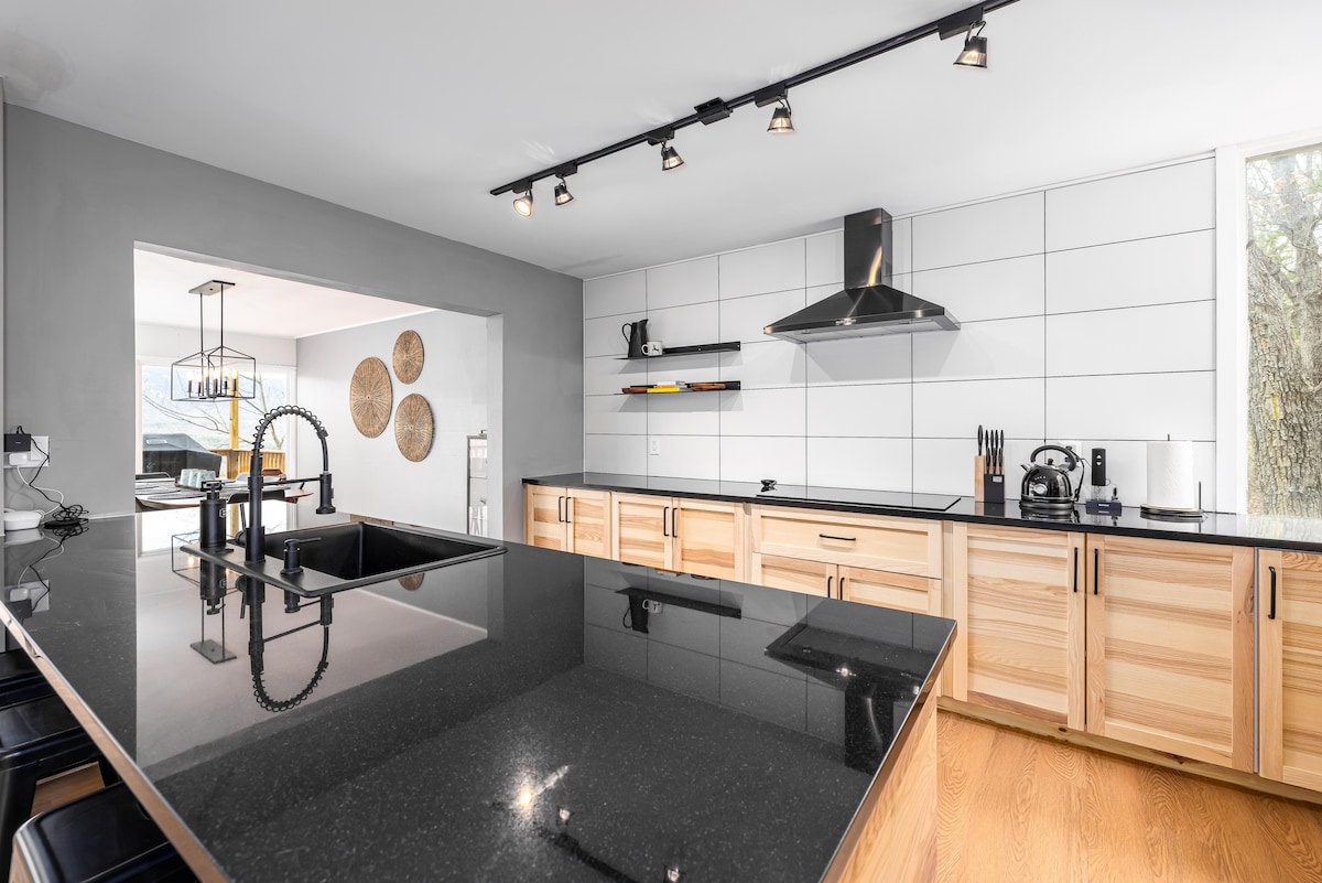 Escápate a The Blue Spruce, un moderno refugio de mediados de siglo en 2,4 acres privados en Caverns Country Club en Luray. Perfecto para parejas o familias, este alojamiento ofrece impresionantes vistas a la montaña y al campo de golf. Disfruta de una bañera de hidromasaje privada, gimnasio en el garaje, fogata y cargador de vehículos eléctricos. Un santuario sofisticado para la relajación y el rejuvenecimiento, que acomoda cómodamente a su grupo.