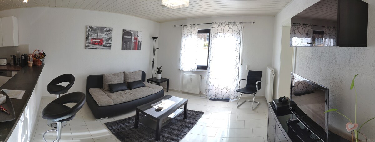 Gemütliche, renovierte Wohnung (ca 60qm), Schlafzimmer mit Doppelbett, im Wohnzimmer ist noch ein Einzelbett, eigenem Bad und eigener Küche. W-LAN und Sat-TV vorhanden! Highlight ist der überdachte Balkon. Ideal auch für Monteure und Arbeiter! Supermarkt, Bistros etc. fussläufig, ruhige Lage mit ausreichend Parkplätzen. Gerne auch zur längeren Anmietung.
