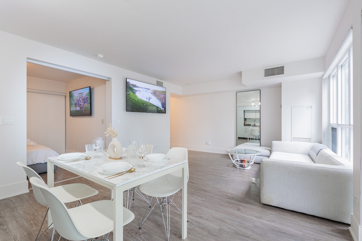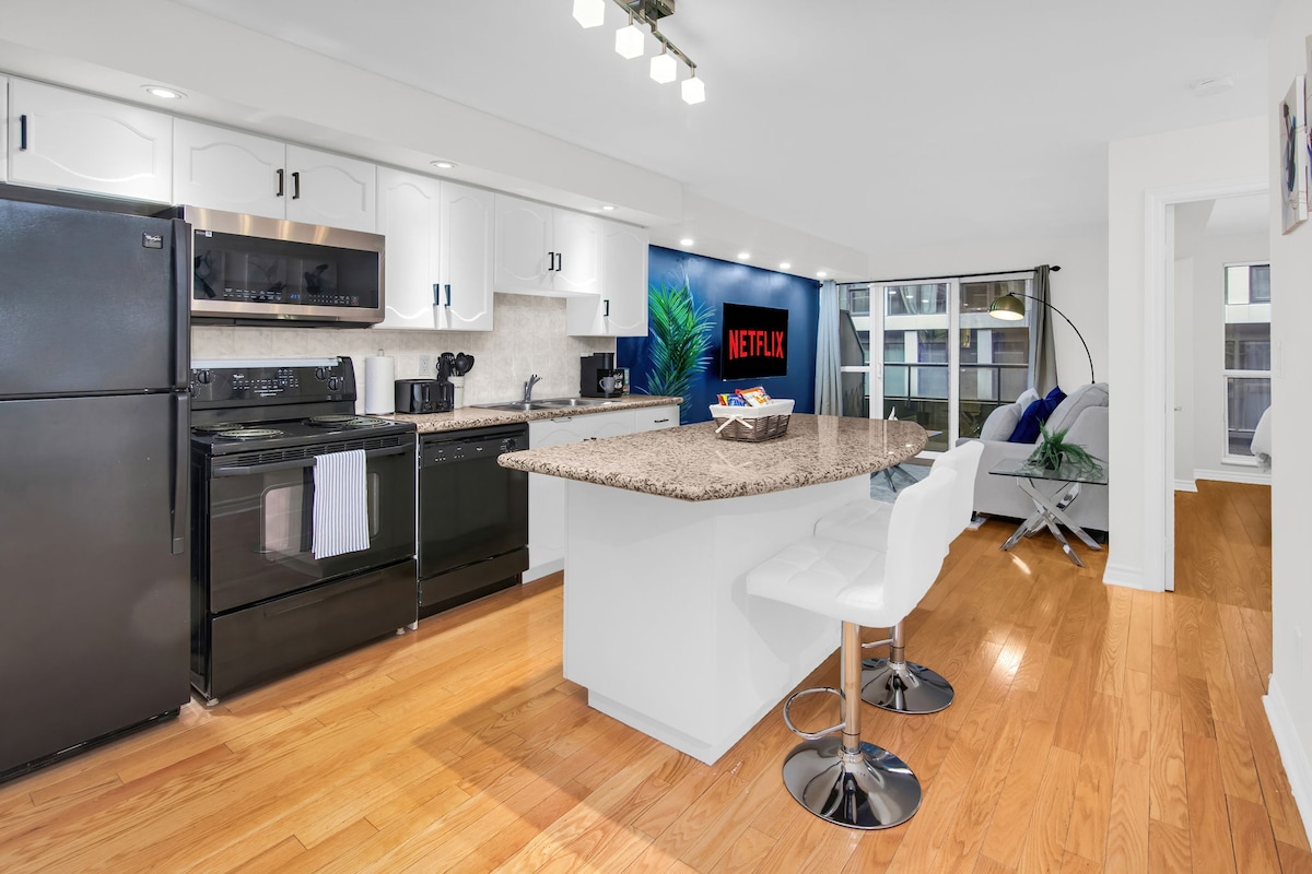 Disfruta de lo mejor de Toronto en nuestro moderno apartamento de un dormitorio más un sofá cama, idealmente ubicado en el vibrante corazón de la ciudad. Disfruta de impresionantes vistas desde un piso alto, ofreciendo un refugio perfecto para exploradores urbanos y viajeros de negocios. Con fácil acceso a las principales atracciones, incluida la icónica Torre CN, y excelentes opciones de transporte, nuestro apartamento combina comodidad con conveniencia, lo que lo convierte en la base ideal para descubrir el encanto y la energía de Toronto.