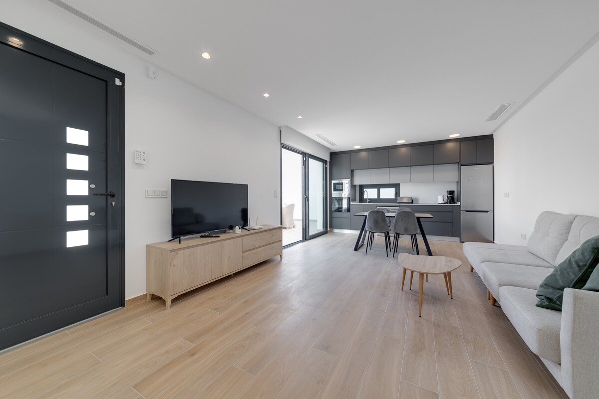Este apartamento de diseño cuenta con unas vistas espectaculares al parque natural y al mar. Con 3 dormitorios y 2 baños, es ideal para toda la familia (capacidad para 6 personas). En la terraza de la azotea, de 80 m², encontrarás una piscina privada con vistas de 180 grados. El apartamento está situado en Rojales, a poca distancia a pie del campo de golf La Marquesa, donde hay varios restaurantes, un supermercado y otros servicios. La playa se encuentra a tan solo 6 km.