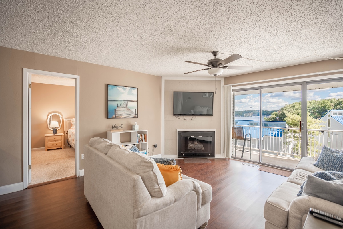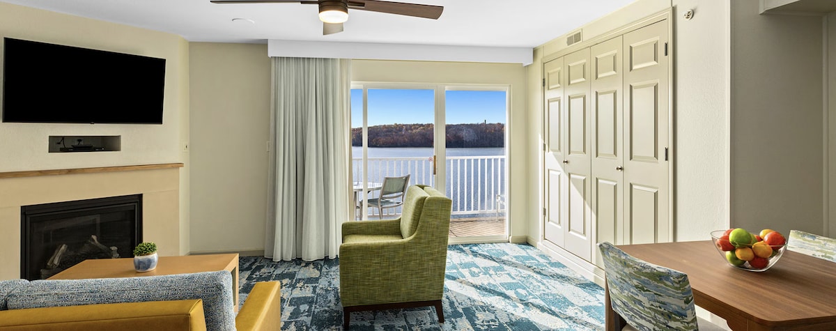 This is a Super Nice Lake Front unit. Sleeps 4 comfortably. Relax and enjoy your Vacation on the Lake. Enjoy the spacious kitchen with new Stainless Steel Appliances and plenty of cabinet space. There is a large balcony with a table and 4 chairs and a Barbeque. Enjoy coffee in the mornings and beautiful evening Sunsets. There is a Great View of the Grand Glaize Bridge. Book now and enjoy your stay!